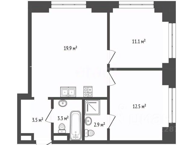 жилая площадь составляет 45.2 кв. м, большая кухня - 10.1 кв. м, и три изолированные комнаты ( 20-14,1-11,1), общая площадь с балконом 75 кВ. м.
