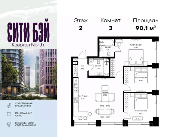 Квартира без отделки, что позволяет оформить интерьер по своему вкусу. Дом оснащен двумя пассажирскими и грузовым высокоскоростными лифтами. Для автовладельцев предусмотрена подземная парковка. Для безопасностей жителей оборудована закрытая охраняемая территория с видеонаблюдением. На первом этаже обустроены стильные дизайнерские лобби, зоны ожидания и ресепшен, а так же предусмотрены лаунж зона, мини-переговорные, детская игровая комната, колясочная, зона коворкинга.