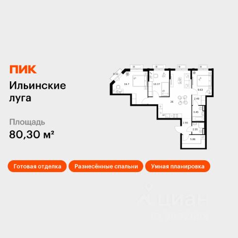 Продаётся 3-комн. квартира площадью 80,7 кв.м на 3 этаже 9 этажного дома (Корпус 2.13, Секция 2) проекта ПИК Ильинские луга. Светлый просторный подъезд на уровне земли, функциональная планировка, большие окна, c отделкой. Жилой район "Ильинские луга" находится в 10 километрах от МКАД по Новорижскому шоссе, в 20 минутах на автомобиле от станций метро "Волоколамская", "Тушинская" и "Строгино". В будущем ближе к проекту, в 9 минутах пути на машине, откроется станция "Ильинская" Рублёво-Архангельской линии, которая будет соединять Арбатско-Покровскую линию и Большую кольцевую линию. Сейчас в квартале начались продажи в корпусах 3.2, 3.3, 3.4, 3.5 и 3.6. "Ильинские луга" — масштабный проект, в который входит девять детских садов, четыре школы и поликлиника. Он строится в престижном и экологичном районе среди лесов и памятников природы. За 5 минут от жилого квартала можно доехать до Рублёво-Успенского шоссе, а за 30 минут — до центра Москвы. До крупного торгового центра "РИГАМОЛЛ" всего 5 минут на автомобиле, а до ТЦ "Твой дом" и гипермаркета "Глобус" — 10 минут. В "Ильинских лугах" строятся только девятиэтажные дома — такая архитектура соответствует спокойной жизни за городом. В каждом дворе-парке есть места для отдыха, детские и спортивные площадки. А ещё, здесь уже открыт большой ПлейХаб "Гравити" — современное игровое пространство с космической тематикой, холмами, зонами для игр и отдыха жителей любого возраста. На первых этажах уже работают магазины, кафе и пекарни. Места для отдыха от "Ильинских лугов" тоже недалеко: 10 минут на машине — и вы в музее-усадьбе "Архангельское". Также рядом находится Лохин остров — памятник природы, где водятся речные черепахи, есть места для кемпинга и возможность сплавиться по реке. Артикул 927556 (Застройщик ООО "СЗ "ГРАДОЛИМП")