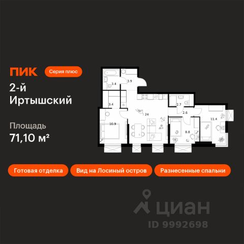 Продаётся 3-комнатная квартира 1011, площадью 71,87 м², на 12 этаже в ЖК "Пехра" корпус 1. Стоимость — от 14490632 руб. Квартира без отделки, планировка распашная, окна во двор.