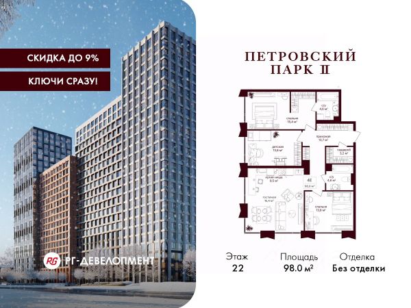 Рассрочка 0% + скидка 2%. Первый платёж 30%, второй - не позднее 31.12.2026 г. Продаётся 3-комнатная квартира 109.6 кв.м. в ЖК "Петровский парк II" на 21-м этаже 25 этажного дома. ЖК "Петровский парк II" — жилой комплекс в Савёловском районе, где город ощущается иначе. Здесь история и масштаб Москвы не давят, а задают фон для спокойной, уверенной жизни рядом с центром. Это место, где статус читается не в громких формулировках, а в окружении, архитектуре и ощущении пространства. Коротко о важном: • Район с глубоким историческим контекстом и парковым окружением; • 5 минут пешком до метро "Динамо", рядом с деловой и культурной жизнью города; • Редкое сочетание: энергия мегаполиса и тишина зелёных аллей; • Архитектура от бюро Syntaxis с пластикой форм и индивидуальным характером фасадов; • Панорамные виды на город и зелёные массивы Петровского и Тимирязевского парков; • Закрытый двор без машин, вдохновлённый эстетикой дворцовых садов; • Просторные гранд-лобби с высокими потолками и выверенной, респектабельной эстетикой; • Частный детский сад во дворе; • Подземный паркинг и кладовые; • РГ-Девелопмент - ТОП-20 крупнейших застройщиков Москвы. Расположение комплекса формирует особое ощущение свободы выбора. Утром - прогулка по тенистым аллеям Петровского парка, днём - работа и встречи в деловых кластерах поблизости, вечером - культурные события, рестораны и городские пространства в нескольких минутах пути. Здесь расстояния измеряются не километрами, а шагами от дома. Архитектура "Петровского парка II" задумана как современная доминанта района и одновременно как уважительный диалог с исторической средой. Асимметричные объёмы, волнообразные элементы и игра света и тени создают выразительный, но сдержанный силуэт. Архитектура наполнена воздухом и визуальным ритмом, оставаясь спокойной и уверенной. Общественные пространства продолжают эту логику. Два гранд-лобби с высокими потолками и благородной цветовой палитрой воспринимаются как пространства, где хочется замедлиться: встретить гостей, перевести дыхание после дня или просто почувствовать уровень среды, в которой вы живёте. Внутренний двор комплекса - это отдельный мир, закрытый от машин и городского шума. Ландшафтный дизайн отсылает к регулярным дворцовым садам: геометрия аллей, зелёные "кабинеты", цветники и камерные зоны отдыха создают разные сценарии для повседневной жизни. Здесь органично соседствуют детские игровые пространства, плейхаб, спортивные зоны и тихие места для отдыха. На территории комплекса расположены магазины, кафе и рестораны, а также частный детский сад, встроенный в общую структуру двора. Подземный паркинг и кладовые поддерживают ощущение порядка и цельности пространства.