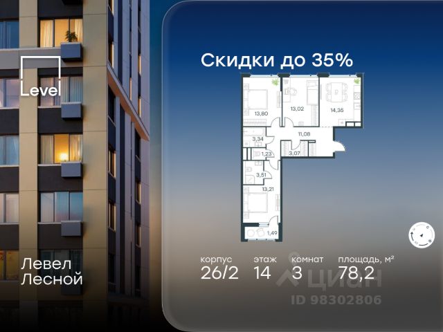 Цена указана с учётом скидки при 100%-й оплате, несубсидированной ипотеке, рассрочке (кроме программы "Рассрочка 0%"). В районе, утопающем в густой зелени лесов, многочисленных парков и скверов, продаётся 3-комнатная квартира площадью 87.10 кв.м с отделкой white box. Квартира расположена на 9 этаже в жилом комплексе комфорт-класса Левел Лесной (компания Level Group/Левел групп). Отличная транспортная доступность: - 25 мин. пешком до станции метро "Пятницкое шоссе"; - 28 мин. на автобусе до станции метро и МЦД-2 "Волоколамская"; - 11 мин. на авто до МКАД; - 25 мин. на авто до ТТК. Продуманный архитектурный проект: - Концепция проекта Левел Лесной от бюро СПИЧ; - Высотность комплекса до 15 этажей с уникальными видами на лесные массивы и город; - Высота потолков до 3 м; - Современные окна высотой до 1,6 м, в части квартир предусмотрены окна в пол. Высота подоконников 0,6 м; Расположение: Жилой комплекс Левел Лесной строится в зелёной зоне ближайшего Подмосковья, г.о. Красногорск в посёлке Отрадное. Шаговая и автомобильная доступность до метро и больших транспортных артерий города. За 25 минут вы дойдёте до станции метро "Пятницкое шоссе", а за 20 минут на машине сможете доехать до станции метро "Тушинская". Район окружен роскошной зеленью лесов и парковых зон, занимающих территорию свыше 1 000 гектаров. Помимо благоприятной экологии, здесь множество возможностей для активного отдыха и поддержания физической формы. Облагороженная территории с полностью развитой инфраструктурой. На территории проекта находится детский сад и школа "Светлые Горы", которая входит в список лучших частных школ от Forbes Education (по данным на 2023г.). Кроме того, в пешей доступности расположено ещё 8 детских садов, а также запланировано открытие современной муниципальной школы. В непосредственной близости находятся сетевые супермаркеты и локальные магазины, аптеки, клиники, почта, библиотека, салоны красоты, рестораны, спортивные и творческие секции, развивающие детские центры. В 12 минутах пешком расположен торговый парк "Отрада" с продуктовым и строительным гипермаркетами, магазинами, кинотеатром и развлечениями для детей. Внутренняя инфраструктура: Мы знаем, как важно, чтобы магазины и сервисы были всегда рядом. В сданных корпусах жилого комплекса Левел Лесной уже расположена полностью готовая развитая инфраструктура. На первых этажах корпуса 27 предусмотрено ещё 14 коммерческих помещений. Благоустройство: Продуманное пространство и аура приватного европейского городка рождают чувство лёгкости и расслабления у каждого, кто попадает на территорию проекта. Концепцию общественных площадок разработали в партнёрстве два архитектурных бюро: "Хайлайт Архитектура" (Highlight Architecture) и "Скейп" (Scape). В безопасных дворах без машин каждый обязательно найдёт себе место для вдохновения, отдыха и спорта.