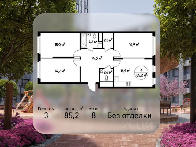Продается трехкомнатная квартира без отделки в 11 фазе города-парка "Первый Московский". Общая площадь квартиры - 94,9 кв. м, этаж 15 из 22. Планируемый срок ввода в эксплуатацию - 1 квартал 2029 года. Тип дома - монолитный. ТОЛЬКО ДО 31 МАРТА выгодные условия на приобретение квартиры в ипотеку или рассрочку. Звоните - и мы подберем оптимальное предложение под ваш запрос! 5 корпус состоит из 2 секций: - 1 секция - без отделки - 2 секция - с отделкой White Box Город-парк "Первый Московский" расположен всего в 7 км по Киевскому шоссе от МКАД на территории Новой Москвы. Из города-парка прямой выезд на Киевское шоссе и трассу Солнцево-Бутово-Варшавское шоссе. ТРАНСПОРТНАЯ ДОСТУПНОСТЬ: - 7 мин. на личном автомобиле или 10 мин. на автобусе до станции метро "Филатов Луг" - 10 мин. на автомобиле или 20 мин. на автобусе до станции метро "Рассказовка" или "Саларьево" ПРЕИМУЩЕСТВА 5 КОРПУСА: - живописные виды на Ульяновский лесопарк - входные группы с безбарьерным входом - просторная колясочная в каждой секции - в каждой секции - 3 лифта: 2 пассажирских, 1 грузовой - количество квартир на этаже: 1 секция - 4 квартиры, 2 секция - 5 квартир - на 1-ом этаже в секции 2 расположено коммерческое помещение - на -1-ом этаже каждой секции запроектированы кладовые помещения - обеспеченность машино-местами: гостевой паркинг 48 м/м, многоуровневые паркинги рядом с домом ВНУТРЕННЯЯ ИНФРАСТРУКТУРА И БЛАГОУСТРОЙСТВО: Дома 11 фазы граничат с Ульяновским лесопарком. Вся территория 11 фазы разделена на 2 типа: - приватное дворовое пространство с детскими игровыми и спортивными площадками. Дворы свободны от машин. - прогулочные маршруты с зонами отдыха. Прогулочный маршрут объединяет дома 11 фазы в единое пространство, за счёт оригинальной геопластики создаётся уникальный разноуровневый ландшафтный узор. РАЗВИТАЯ ИНФРАСТРУКТУРА В ОКРУЖЕНИИ: - общеобразовательная школа 2120 корпус ш3 (всего в проекте 5 школ) - детский сад 2120 корпус д4 (всего в проекте 8 детских садов) - школа искусств - поликлиника - торговый центр Столица - кафе, продуктовые магазины, аптеки, фитнес центры, салоны красоты и пр. - в пешей доступности благоустроенный парк Филатов Луг