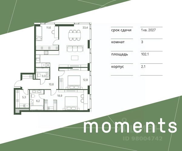 В продаже 3-комнатная квартира в клубном жилом комплексе бизнес-класса "Интонация". Общая площадь квартиры - 104.80 м2. Этаж 2 из 21. Корпус 1. Дом - кирпично-монолитный. Большие окна - высота проема до 2,1 м. Высота потолков - до 3,1 м. Стоимость квартиры - 52976400 р. Комплекс состоит из двух 21-этажных корпусов, дома введены в эксплуатацию в IV кв. 2023 года. ЖК "Интонация" - это клубный проект с авторской архитектурой от бюро APEX. Преимущества бизнес-класса для резидентов: - закрытая территория, бесконтактный доступ, видеонаблюдение 24/7; - дизайнерские лобби от DBA-Group; - консьерж-сервис и стойка ресепшн; - подземный паркинг с келлерами от 3 до 16 кв. м; - приватный внутренний двор, - зона пикника на открытом воздухе и ландшафтный сад на террасе от архитекторов BUGAEV Parks & Gardens; - детские и спортивные площадки европейского уровня от Wowhaus; - все квартиры оборудованы системой "Умный дом". Инфраструктура лобби: - зона ожидания, - гостевой санузел, - лапомойка, - колясочная, - помещение для хранения посылок. Стильный клубный дом бизнес-класса "Интонация" построен в старомосковском районе Щукино в окружении зелени. Прямой удобный выезд на Волоколамское шоссе в сторону центра займет 2 минуты, дорога до ТТК - 10 минут, до Садового кольца - 15-20 минут. В пешей доступности от ЖК "Интонация": - Всехсвятская роща - 5 минут ходьбы; - Щукинский парк - 7 минут пешком; - парк Покровское-Стрешнево - 10 минут ходьбы; - метро "Щукинская" - 10 минут пешком; - МЦК "Стрешнево" - 10 минут пешком; В радиусе 10-15 минут ходьбы также расположены: высокорейтинговая Курчатовская школа с детским садом, поликлиника, рестораны, салоны красоты, фитнес-клубы, а также торговый центр "Щука". Звоните, чтобы узнать подробности о специальных условиях покупки! 3-комнатная квартира в ипотеку в новостройке рядом с метро Щукинская.