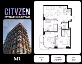 Продается 3-комнатная квартира от застройщика в жилом мультиквартале СИТИДЗЕН на 10-м этаже в корпусе #1 урбан-блока PARUS. Общая площадь лота составляет 79 м² В лобби корпуса #1 урбан-блока PARUS представлены: 1. Grand-лобби с зоной отдыха 2. Лапомойка 3. Переговорная 4. Коворкинг 5. Постаматы 6. Почта 7. Колясочная 8. Лифтовой холл 9. Санузел 10. Комната консьержа с с /у СИТИДЗЕН — это большой город в миниатюре. Инфраструктура мультиквартала организована по принципу шаговой доступности от подъезда до любой нужной точки: супермаркета, кофейни, салона красоты, фитнес-центра и др. В домах представлены лобби с атмосферой премиального резорта, дизайн которых вдохновлен французскими интерьерами 1960-х годов. Концепция благоустройства территории мультиквартала предусматривает большое количество вечнозеленых растений, что создает ощущение максимальной близости к природе. Жителей квартала ждут места для отдыха, игр, занятий спортом и прогулок с домашними питомцами. В приватном дворе с собственным садом предусмотрена зеленая комьюнити-гостиная для дружеского отдыха и общения, одна из стен которой подходит для кинопроекций, а также зеленый рабочий кабинет в саду (бизнес-гардена), оборудованный wi-fi станцией и usb-разъёмами для зарядки устройств. Маленьких жителей ждут авторские игровые площадки для разных возрастных групп (от 0 до 12 лет). Начало строительства - 1 квартал 2024 года. Окончание строительства - 3 квартал 2027 годаКомпания MR предлагает своим клиентам специальные условия приобретения квартир в рамках программ ипотечного кредитования от банков-партнеров.