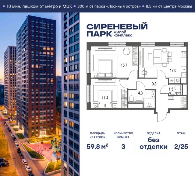 Продается 3-к квартира без отделки в ЖК "Sokolinn Park". Общая площадь квартиры — 79.5 кв. м, этаж 3 из 12. Тип дома — монолитный. Цена указана при 100% оплате. Sokolinn Park — место, где природа и комфорт идеально сочетаются. Он расположен в живописном Богородском районе на востоке Москвы, всего в 8 минутах от станции метро "Преображенская площадь". Близость национального парка "Лосиный остров" и знаменитого парка "Сокольники" делает Sokolinn Park привлекательным для тех, кто ценит естественную красоту окружающего мира и активный образ жизни. Развитая инфраструктура в шаговой доступности обеспечивает удобство и комфорт для жителей комплекса. Архитектурная концепция Sokolinn Park сочетает эстетику и функциональность. Фасады зданий выполнены с использованием бетонной плитки с имитацией кирпичной кладки и композитных панелей. Динамичный силуэт двух корпусов с переменной этажностью гармонично вписывается в городской ландшафт. Панорамные окна обеспечивают естественное освещение и открывают живописные виды на окружающую природу, а стеклянные французские балкконы придают фасаду лёгкость и прозрачность. Благоустройство придомовой территории Sokolinn Park разработано с учётом разнообразных сценариев использования в течение дня. Концепция объединяет несколько функциональных зон: для встреч с друзьями, спокойного отдыха и поддержания активного образа жизни. Планировочные решения разработаны с акцентом на функциональность и комфорт проживания. В проекте представлены различные типы квартир: от уютных однокомнатных до просторных трёхкомнатных. Также в ассортименте есть квартиры с угловым остеклением и широкими панорамными окнами, которые открывают живописные виды.