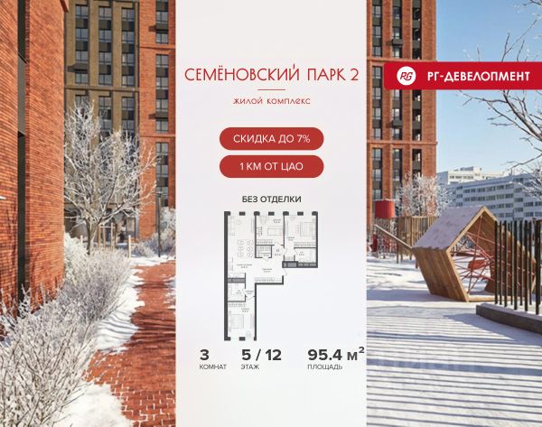 Ипотека для каждого! Полная стоимость кредита от 12,378% до 18,537%. Ставка от 0,11% в АО "Альфа-Банк", ген. лицензия ЦБ РФ 1326 от 16.01.2015. Ставка фиксируется на первые 12 месяцев, далее полная стоимость кредита от 22,025% до 24,935% ставка 21,59%. Первоначальный взнос — от 20,1% от стоимости квартиры. Срок кредитования — от 4 до 30 лет. Ипотека на весь срок! Полная стоимость кредита от 23,396% до 26,058% со ставкой 14,5%! Первоначальный взнос —от 20,01% от стоимости квартиры. Срок кредитования — от 3 до 30 лет. АО "Банк ДОМ.РФ" универсальная лицензия Банка России 2312 от 19.12.2018. Скидка 7% при покупке квартиры! Цена указана с учетом максимального размера скидки. Продается 3-к квартира 95,4 кв.м. в ЖК "Семеновский парк 2" на 5-м этаже 12 этажного дома. Компания "РГ-Девелопмент" предоставляет скидку на квартиры в жилом комплексе. Акция действительна до 28.02.2026 включительно. Чтобы воспользоваться предложением, необходимо подписать договор на приобретение недвижимости до 28.02.2026 включительно. Компания "РГ-Девелопмент" вошла в ТОП-10 девелоперов по объёму введённого жилья в "Старой Москве" по итогам 2025 года. Прямая продажа от застройщика! Квартиры без отделки. Срок сдачи корпуса - 1 кв. 2026 г. ЖК "Семеновский парк 2" - это идеальное место для того, чтобы стать вашим домом. Проект расположен в исторической части Москвы вблизи Измайловского лесопарка, в 1 км от ЦАО. 4 станции метро отделяют вас от Красной площади и 15 минут на автомобиле - от Садового кольца.