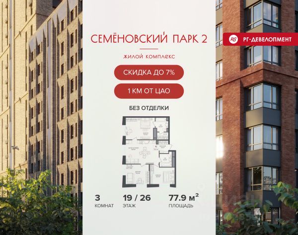 Ипотека для каждого! Полная стоимость кредита от 12,380% до 18,537%. Ставка от 0,11% в АО "Альфа-Банк", ген. лицензия ЦБ РФ 1326 от 16.01.2015. Ставка фиксируется на первые 12 месяцев, далее полная стоимость кредита от 22,022% до 24,599% ставка 21,59%. Первоначальный взнос — от 20,1% от стоимости квартиры. Срок кредитования — от 4 до 30 лет. Ипотека на весь срок! Полная стоимость кредита от 23,396% до 26,058% со ставкой 14,5%! Первоначальный взнос —от 20,01% от стоимости квартиры. Срок кредитования — от 3 до 30 лет. АО "Банк ДОМ.РФ" универсальная лицензия Банка России 2312 от 19.12.2018. Скидка 7% при покупке квартиры! Цена указана с учетом максимального размера скидки. Продается 3-к квартира 77,9 кв.м. в ЖК "Семеновский парк 2" на 19-м этаже 26 этажного дома. Компания "РГ-Девелопмент" предоставляет скидку на квартиры в жилом комплексе. Акция действительна до 15.04.2026 включительно. Чтобы воспользоваться предложением, необходимо подписать договор на приобретение недвижимости до 15.04.2026 включительно. Компания "РГ-Девелопмент" вошла в ТОП-10 девелоперов по объёму введённого жилья в "Старой Москве" по итогам 2025 года. Прямая продажа от застройщика! Квартиры без отделки. Срок сдачи корпуса - 1 кв. 2026 г., корпус сдан. Выдача ключей. ЖК "Семеновский парк 2" - это идеальное место для того, чтобы стать вашим домом. Проект расположен в исторической части Москвы вблизи Измайловского лесопарка, в 1 км от ЦАО. 4 станции метро отделяют вас от Красной площади и 15 минут на автомобиле - от Садового кольца.
