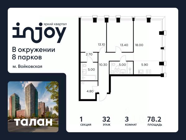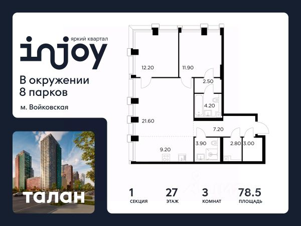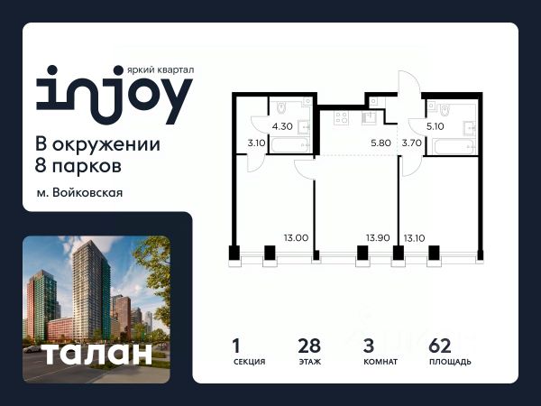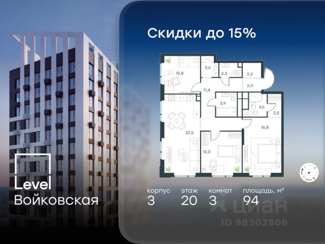 Цена указана с учётом скидки при 100%-й оплате, несубсидированной ипотеке, рассрочке (кроме программы "Рассрочка 0%"). Продается 3-комнатная квартира площадью 88.60 кв. м без отделки. Квартира находится на 14 этаже 20-этажного корпуса 5, в новом жилом комплексе бизнес-класса Level Войковская, расположенном рядом с живописным заповедником "Покровское-Стрешнево" (застройщик - компания Level Group/Левел групп). Прекрасная транспортная доступность - 7 мин. пешком до станции МЦК "Балтийская"; - 15 мин. пешком до станции метро "Войковская"; - 8 мин. на машине до ТТК; - 15 мин. на машине до центра Москвы; - 20 мин. на машине до Москва-Сити. Продуманный архитектурный проект - стильная архитектура от мастерской Фефелова В. В.; - панорамные виды на парки, Химкинское водохранилище и Останкинскую башню; - лобби с высотой потолков до 6,45 метров; - более 20 видов планировочных решений, включая редкие форматы квартир с террасой и увеличенной высотой потолков до 5,42 метров; - 2 варианта дизайнерской отделки в корпусе 4, предлагаются как дополнительная опция к отделке white box: стиль Modern в светлых холодных тонах и стиль Classic в нейтральной бежевой гамме. Квартиры в корпусах 3 и 5 сдаются без отделки. Расположение Level Войковская строится в престижном Северном округе Москвы. Развитая инфраструктура и живописная природа переплетаются в единый ансамбль, столь значимый для комфортной жизни. Войковский район окружают парки и набережные. В шаговой доступности - парк "Покровское-Стрешнево", не более 15-ти минут на велосипеде занимает путь до Тимирязевского парка и 9-ти минут до парка усадьбы Михалково. Рядом более 60 школ, 75 дошкольных учреждений, 17 государственных и 6 частных вузов, 25 супермаркетов, 4 торговых центра, среди которых ТЦ "Метрополис" и ТЦ "Авиапарк". Внутренняя инфраструктура На территории жилого комплекса предусмотрены коммерческие помещения: кафе, ресторан, пекарня и другие сервисы откроются на первых этажах корпусов. Для жителей будет доступен отапливаемый подземный паркинг на 244 машино-места с доступом с любого этажа на лифте. На территории паркинга будет расположено 125 кладовых помещений для хранения сезонного инвентаря. Лобби и благоустройство Дизайн лобби Level Войковская создан совместно с бюро BLANK. Это уютные гостиные, где хочется задержаться. Теплая цветовая гамма, ресепшен, зоны ожидания, лапомойки и гостевые санузлы - каждая деталь превращает лобби в комфортное продолжение вашего дома. 1,15 га площади в первых двух этапах строительства отведено под приватный внутренний двор, который спроектирован совместно с бюро "Правда". Детские площадки для всех возрастов, спортивные пространства для йоги, воркаута и петанка, уютные зоны для тихого отдыха или работы. Здесь утро начинается с вдохновения, а вечер наполнен приятными моментами. Лифты Комфортное перемещение внутри жилого комплекса будут обеспечивать надёжные лифты с доступом в паркинг с жилых этажей. В каждом корпусе предусмотрено по 3 грузопассажирских лифта. Продам 3-комнатную квартиру в ипотеку в новостройке в районе Войковский в Москве.