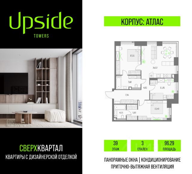Продаётся 3-комнатная квартира площадью 86.47 кв.м на 34 этаже 47 этажного корпуса Атлас в квартале небоскребов "Upside Towers". В квартире отделка White-box, c видом на корпус Монте Бьянко, корпус Эверест, внутренний двор, ландшафтный парк, Парк Сокольники, Останкинскую Башню. Номер квартиры Б3408. Upside Towers - технологичный квартал строится в динамично развивающемся Бутырском районе, в 3 мин. от метро, в 5 мин. от ТТК. На территории 7 га возводится 5 высотных башен от 19 до 58 этажей, названных в честь главных вершин земли. Квартиры с панорамными окнами в пол, высокими потолками и современными инженерными решениями. Благоустроенная зеленая территория включает: приватные дворы, природный комплекс, прогулочный бульвар, ландшафтный парк 2,5 га с сенсорным садом и многофункциональными игровыми и спортивными площадками. В корпусе откроются магазины, кафе и рестораны, а также другие объекты коммерческой инфраструктуры. На последнем этаже корпуса предусмотрен SPA Relax центр с панорамным видом на город. Собственники квартир смогут в любое удобное для них время забронировать посещение спа-зоны через смарт-приложение. Дня них будут доступны джакузи, пространства для занятий йогой, а также места для отдыха и релаксации. Большое внимание в проекте уделяется созданию социальной инфраструктуры. Между "Атласом" и "Олимпом" в трехэтажном стилобате разместится уникальное пространство закрытый клуб для жителей квартала Upside Club площадью 2 000 кв. м. Здесь появится каминный зал с роялем, многофункциональная детская зона c двухуровневым игровым оборудованием для малышей и дошкольников, плей-рум для подростков, домашний кинотеатр, коворкинг, переговорные и лектории. На крыше стилобата разместится всесезонная BBQ патио-зона с верандой и закрытыми помещениями для приготовления и отдыха. В башнях откроются смотровые террасы для резидентов с панорамными видами на город, парки, Останкинскую башню, ВДНХ, Ботанический сад и Москва-Сити. Покупая квартиру даже самого минимального размера в Upside Towers, вы получаете в пользование 2 000 м² бесплатных общественных пространств. В рамках проекта строится государственная школа и детский сад, разместится более 15 000 кв.м. коммерческой инфраструктуры. Насыщенная социальная инфраструктура формирует множество сценариев для жизни на территории квартала. В Upside Towers применяются лучшие технологии и практики, чтобы обеспечить высшее качество жизни: Воздух, не уступающий по качеству горному, обеспечит приточно-вытяжная вентиляция. Пятиступенчатая очистка воды с сохранением полезных минералов. Центральное кондиционирование. Внутрипольные конвекторы с естественной конвекцией. Современные системы безопасности и мониторинга микроклимата. Высокоскоростной интернет на всей территории, в квартирах и паркинге за счет усиления GSM-связи всех ведущих операторов. Все места в подземном паркинге оборудованы зарядками для электрокаров. Бутырский район непрерывно развивается и готовится стать новым современным деловым районо Продается 3-комнатная квартира в новостройке в районе Бутырский в Москве.