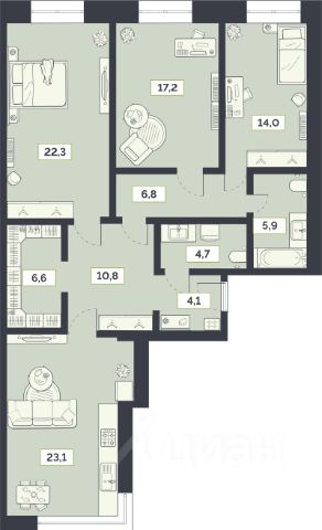 Продаётся 3-комнатная квартира общей площадью 100.70 кв. м на 7 этаже жилого квартала бизнес-класса iLove. Это просторная, светлая квартира подойдет для большой семьи, в ней три полноценные спальни и кухня-гостиная. В квартире предусмотрено 2 гардеробных комнаты и 2 санузла один в мастер-блоке и один гостевой. Широкоформатные окна в квартире выходят на разные стороны, из них открываются отличные виды на город и на Останкинскую телебашню. Квартира продается без отделки. Жилой квартал iLove расположен в тихом зеленом районе Останкино. До метро "Алексеевская" всего 10 минут пешком, а на автомобиле можно добраться до ТТК за 6 минут. iLove состоит из 5 корпусов переменной этажности, каждый корпус которых имеет вертикальные высотные и среднеэтажные горизонтальные фасады. Из окон большинства квартир открываются прекрасные виды на Останкино. Для удобства жильцов предусмотрены подземная и гостевая парковки, а внутренняя территория комплекса свободна от машин. Благоустроенный двор с детскими и спортивными площадками и дизайнерский подъезд с панорамными окнами создают приятную атмосферу для жизни. В проекте реализуется концепция "город в городе" вся необходимая инфраструктура расположена на первых этажах зданий, запроектирован комьюнити-центр (общественное пространство для отдыха и досуга жителей квартала). В 2025 году на территории жилого комплекса запланировано открытие детского сада. В пешей доступности находятся продуктовые магазины, кафе и рестораны, школы и поликлиники. В ближайшем окружении крупные парки ВДНХ, парк "Останкино", Ботанический сад, Сокольники.