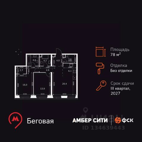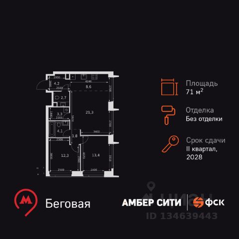 Прямая продажа от застройщика! Успейте забронировать квартиру до повышения стоимости! Жилой Комплекс премиум-класса. Продаётся 3-к квартира номер 668 общей площадью 68.7 кв.м. на 4-м этаже 57 этажного здания. Без отделки. Цена с учётом скидки. Особенности квартиры: - Организуем показ в удобное для вас время! - Угловая планировка - больше пространства для ваших идей. - Увеличенная ширина окна/окон - больше света и визуального простора. - Увеличенное количество окон - дополнительное освещение и свежий воздух. - Нестандартное окно - особенный акцент в вашем интерьере. - Увеличенная высота окна - больше воздуха и света. - Панорамное окно - создайте атмосферу открытости и простора. - Гостевой санузел - комфорт и удобство для ваших гостей. - Постирочная - организуйте пространство для стирки и сушки вещей. - Евроформат - просторное и удобное жилье с отличной планировкой. - Гибкая планировка - создайте пространство по своему вкусу. - Место для игры/занятия спортом - идеальное пространство для активных детей. - Можно оборудовать рабочее место - комфорт для работы и учёбы. - Просторная мягкая зона - комфорт и уют для отдыха всей семьи. - Линейная кухня - функциональность и практичность в одном решении. - Проходная кухня-гостиная - идеальное пространство для общения и готовки. - Ниша под шкаф - компактное и удобное место для вещей. Квартира без отделки. Чистый холст для воплощения интерьера вашей мечты. Информация о комплексе: ЖК "Амбер Сити" - вдохновляющий квартал у Москва-Сити с архитектурой мирового уровня. Здесь кипит жизнь 24/7: парки, инфраструктура и виды на центр без городской суеты. Самодостаточная среда для работы, творчества и семьи в духе лучших районов Нью-Йорка и Гонконга. Транспортная доступность: Квартал с исключительной транспортной доступностью: ключевые точки Москвы в 15-20 минутах. Полное погружение в деловую и культурную жизнь столицы с минимальными затратами времени на дорогу. Общественный транспорт: - Метро "Беговая" - 5 минут пешком - Остановка "2-й Хорошёвский проезд" - 3 минуты пешком - Метро "Звенигородская" (строящаяся) - 10 минут пешком На автомобиле: - Москва-Сити - 10 минут - Звенигородское шоссе - 3 минуты - ТТК - 5 минут - Серебряный бор - 8 минут - Садовое кольцо - 12 минут - Кремль - 20 минут - Шереметьево - 40 минут Внутренняя инфраструктура: ЖК "Амбер Сити": многоуровневый ландшафт на 6 гектарах с зелёным бульваром, объединяющим арт-объекты, водные зоны и архитектурные формы. В закрытых дворах на стилобате - детские площадки с сенсорными элементами, зоны отдыха с креслами и настилами для йоги. Навесы с подогревом и зарядками для зимнего сезона. Активности на любой вкус: настольный теннис, петанк, чтение в тишине на оборудованных скамейках. Продуманное пространство для ежедневного отдыха и игр детей и взрослых. Продам 3-комнатную квартиру в новостройке рядом с метро Беговая.