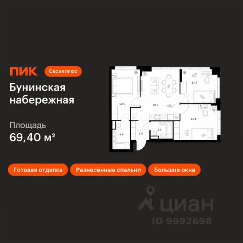 Продаётся 3-комн. квартира площадью 70,1 кв.м на 4 этаже 16 этажного дома (Корпус 2.6/1.3, Секция 3) проекта ПИК Бунинская набережная. Светлый просторный подъезд на уровне земли, функциональная планировка, большие окна, c отделкой. Удобное расположение: 18 минут пешком от м. "Потапово" и 12 минут на автомобиле до станции "Бунинская аллея". 12 минут на автомобиле до трассы Солнцево — Бутово — Варшавское шоссе. 20 минут на автомобиле до МКАД и Калужского шоссе. 1520 минут езды до живописных парков: "Бутовский лесопарк", заказник "Южное Бутово". Особенности проекта Камерный квартал в Новой Москве, на берегу Ивановского пруда. Одна из ключевых особенностей проекта — квартиры с панорамным видом на воду. Архитекторы вдохновились локацией проекта: природные оттенки и активная пластика корпусов напоминают рельефные выступы на берегу, а окна отражают водную гладь, визуально объединяя дома с природой. Преимущества проекта Светлые и просторные лобби с зонами ожидания. Подземный паркинг. Набережная и пешеходная аллея для прогулок. Парк на склоне с игровой зоной. Готовая инфраструктура района: 3 школы, 6 детских садов, взрослая и детская поликлиники. Артикул 968831 (Застройщик ООО СЗ "Стройком")