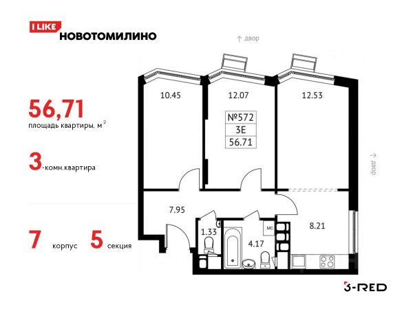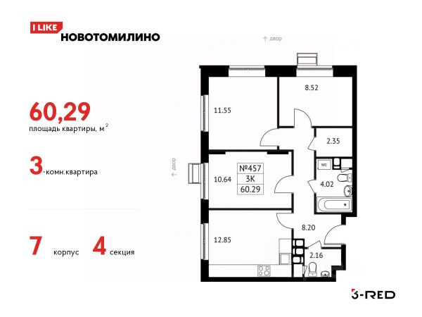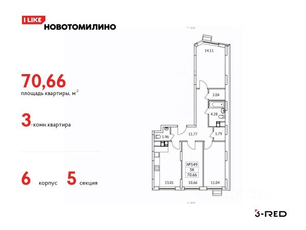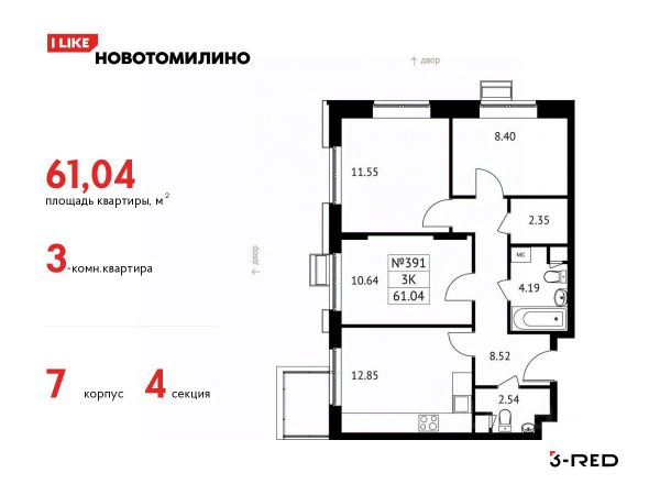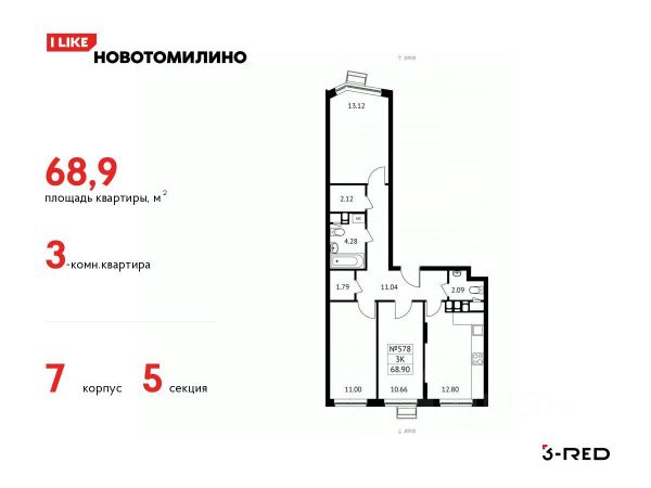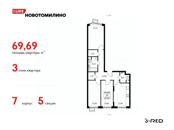 Общая площадь: 61.70 м.кв., Жилая площадь: 32.00 м.кв., Площадь кухни: 10.00 м.кв.