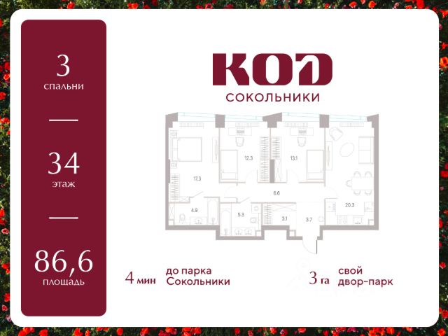 В семейном жилом квартале, расположенном в окружении более 500 га леса и объектов исторического наследия, продается 3-комнатная квартира площадью 82 кв. м без отделки. Квартира расположена на 6 этаже 39-этажного корпуса 2.1 жилого квартала бизнес-класса КОД Сокольники от девелопера Новая Эра. Отличная транспортная доступность - 3 мин. пешком до станции МЦД-3 "Митьково"; - 7 мин. пешком до станции метро "Сокольники"; - Удобный выезд на Русаковскую улицу; - 5 мин. на авто до ТТК; - 15 мин. на авто до Садового кольца. Продуманный архитектурный проект - Выразительная архитектура, созданная бюро "Остоженка"; - 70% квартир в квартале - видовые, что позволяет ежедневно наслаждаться панорамами на парк Сокольники, Останкинскую телебашню, исторический центр и Алексеевский монастырь; - 30% квартир - угловые. Увеличенные оконные проемы, панорамное остекление и продуманное расположение комнат усиливают эффект обзорности: гостиные и спальни получают максимум дневного света и живописные виды, которые становятся частью интерьера; - Высокие потолки от 3 метров в типовых планировках; - Дизайнерские лобби от модной студии 211.Studio; - Двухуровневый паркинг с подогреваемой рампой и пологим заездом, подходящим даже для спорткаров; Расположение Семейный жилой квартал КОД Сокольники - это дома бизнес-класса в престижном районе Сокольники. Район отличает хорошая транспортная доступность: несколько минут пешком до станции метро "Сокольники" и платформы МЦД-3 ("Митьково"), регулярные трамвайные и автобусные маршруты, удобный выезд на Русаковскую улицу и Третье транспортное кольцо. До Садового кольца можно доехать за 15 минут. Для пешеходов и велосипедистов в парковой зоне будут оборудованы широкие тротуары и велодорожки, обеспечивая комфортные условия для активного образа жизни. Внутренняя инфраструктура Резидентам будет доступна развитая клубная инфраструктура: собственный фитнес-рум, коворкинг с панорамным видом на парк, игровая комната для детей, пространства для мастер-классов и просторная гостиная, которую можно использовать для отдыха, просмотра кино или проведения мероприятий. На первых этажах жилых домов разместятся объекты стрит-ритейла: кафе, рестораны, магазины и различные сервисы - от аптек и салонов красоты до ателье и барбершопов. Рядом с жилыми корпусами появится деловой квартал с офисами и торговыми площадями на 75 тысяч кв. м, что делает проект привлекательным для тех, кто ценит возможность жить и работать поблизости. Благоустройство Центральным элементом квартала станет благоустроенный двор-парк площадью 3 га с собственным прудом и зелеными зонами для прогулок и отдыха. В границах двора предусмотрены современные игровые и спортивные площадки: мультифункциональная зона воркаута, площадки для волейбола и стритбола, площадки для пилатеса и йоги, скалодром, а также беговые и веломаршруты. В состав проекта войдет образовательный центр, включающий детский сад для 350 малышей, а также школу на 650 учеников. Продам 3-комнатную квартиру в новостройке рядом с метро Красносельская.