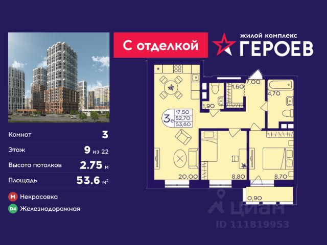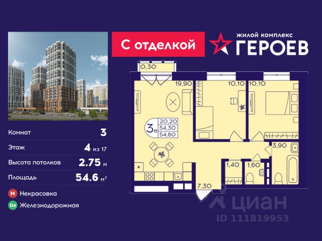 Продаётся 3-комнатная квартира 63.5 кв. м. в жилом комплексе "Героев" в Балашихе, Железнодорожный. Квартира расположена на 2 этаже 407 корпуса. Все квартиры представлены с чистовой отделкой. Вам не нужно тратить время и дополнительные финансы на ремонт или жить в шуме строительных работ - достаточно перевести свои вещи, расставить мебель и всё готово! Жилой квартал "Героев" - это уютный проект для семей с детьми. Всего 40 минут до центра Москвы. В квартале созданы все условия для досуга всех возрастов: игровые и спортивные площадки, места для отдыха и прогулок, магазины, кафе и пункты выдачи. За 15 минут можно дойти от дома до Ольгинского лесопарка - популярного места для прогулок и отдыха на свежем воздухе. Здесь приятно гулять всей семьёй, заниматься спортом или устроить пикник в выходной день. Преимущества: Квартира с готовой отделкой. Пространство полностью подготовлено для жизни: не нужно тратить время и деньги на ремонт или ждать его окончания. После получения ключей достаточно расставить мебель - и можно сразу заезжать и жить. Продуманные и светлые планировки. Просторные кухни-гостиные создают комфортное пространство для отдыха и встреч с близкими. В квартирах предусмотрены удобные гардеробные, благодаря чему легко поддерживать порядок и не перегружать комнаты шкафами. Увеличенное остекление. Большие окна наполняют квартиру естественным светом в течение всего дня, создавая ощущение простора и уюта, а также визуально расширяя пространство и делая интерьер более воздушным. Пешая доступность до станции Железнодорожная (МЦД-4) - дорога займёт не более 30 минут до центра Москвы: станции метро "Курская", "Площадь Ильича" или ТПУ Нижегородская.