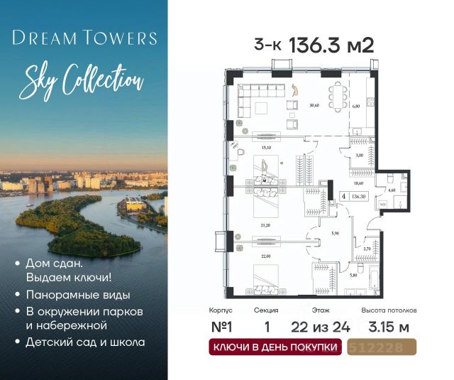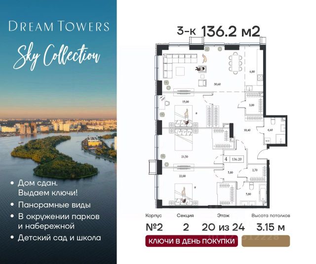 Рассрочка 0% от застройщика. Ключи в день покупки. ЖК Dream Towers проект премиум-класса в окружении парков и набережной, с полностью готовой инфраструктурой для комфортной жизни и отдыха. Продаётся 3-квартира на 6 этаже 6-этажного дома (3 корпус). Общая площадь: 92.7 кв.м. Высота потолков от 3.50 м. Город-курорт на 100 Га в шаге от вашего дома: - пляжный комлекс Dream Beach Club; - парк аттракционов Остров Мечты; - 44 Га ландшафтных парков; - пешеходная набережная; - яхт-клуб; - Южный речной вокзал; - вейк-парк и многое другое. В Dream Towers предусмотрено все для комфортной жизни с семьей: - дизайнерские лобби с общественной гостиной, колясочной и лапомойками; - охраняемый благоустроенной двор только для жителей; - собственный десткий сад и школа прямо во дворе; - красивая архитектура зданий в стиле Ар-деко; - облицовка фасадов из натурального камня с архитектурной подсветкой; - широкоформатное остекление окон в пол для лучших видовых характеристик на парки и пойму Москвы-реки; - подземный паркинг; - клубный формат проживания; - эргономичные планировки от 40 до 162 м2; - высокие потолки от 3,15 до 4,1 м; - квартиры с террасами; - вся необходимая инфраструктура на первых этажах домов, а также в торговой части тематического парка "Остров Мечты" (рестораны, кафе, супермаркет, магазины, салон красоты, йога-студия и многое другое). Центр рядом: 15 минут до Садового кольца на авто, 20 минут до Сити или Кремля. В 5 минутах прогулочным шагом — станция метро "Технопарк".