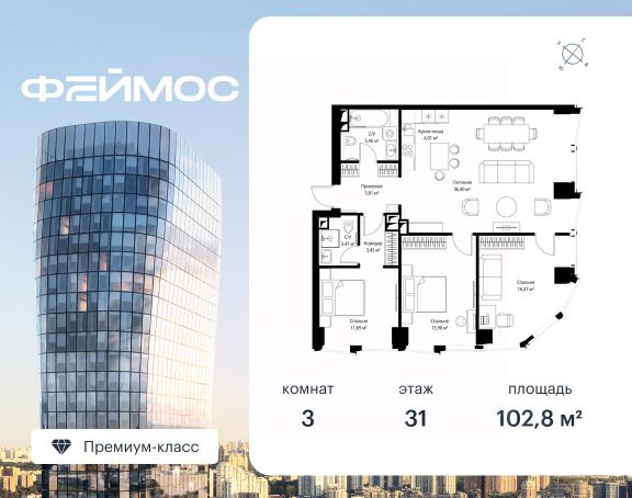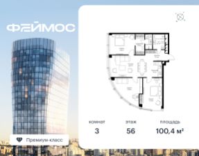 Продаётся 3-комнатная квартира площадью 82.40 м² с предчистовой отделкой на 5-м этаже премиального небоскреба Феймос.
