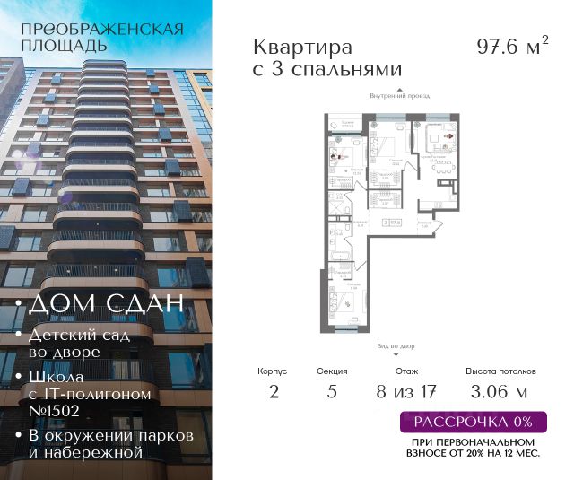 Функциональная планировка: кухня-гостиная 15,4 кв.м, гостевой санузел, гардеробная, мастер-спальня 11,4 кв.м c гардеробом и ванной комнатой, спальня с рабочей зоной, угловым остеклением и выходом на лоджию. В квартире 5 окон, высокие потолки 3.25 метра, благодаря чему пространство наполняется естественным светом.