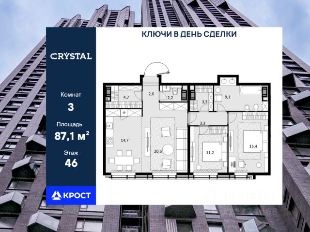 Однокомнатная квартира площадью 87,1 кв.м. на 46 этаже дома бизнес-класса "CRYSTAL Трилогия". Жилой комплекс CRYSTAL Трилогия комфорт в сердце Хорошево-Мнёвников Удобное расположение и транспортная доступность CRYSTAL Трилогия расположен в престижном районе Хорошево-Мнёвники, на улице Генерала Глаголева, всего в нескольких минутах от живописного Серебряного бора и набережной Москвы-реки. Из окон открываются панорамные виды на воду и зелёные зоны, создавая ощущение гармонии с природой. Автомобильная доступность • Звенигородское шоссе и проспект Маршала Жукова быстрый выезд в любую часть города. • 7 км до ТТК, 9 км до МКАД, 10 км до Садового кольца. • Общественный транспорт: • Ближайшая станция метро "Народное ополчение" (2 км). Добраться можно пешком или на автобусе. • В пешей доступности строятся 3 новые станции метро, что повысит транспортную связанность района. Инфраструктура: всё для жизни в шаговой доступности Комплекс входит в состав масштабного квартала Union Park (40 га) это современная городская среда с продуманной инфраструктурой. Образование и развитие: • Лучшие школы Москвы: 1515, 1517, 138, Курчатовская школа. • Детские сады: "Wow Kids Серебряный бор", логопедический "ДАРвиль". • Музыкальная школа им. В. В. Андреева. Медицина и спорт: • Поликлиника "Семейный доктор", медцентр "Мед-Лайт", стоматология. • Спорткомплекс "Серебряный" с бассейном, тренажерным залом и солярием. Магазины и рестораны: • Премиальные магазины: "Азбука вкуса", "ВкусВилл", "Лента", "Магнолия". • Рестораны и кафе: Asia Inn, Wells Home Cafe, рыбный ресторан The Mope. Футуристичная архитектура с продуманным комфортом CRYSTAL Трилогия это уникальный дизайн и эргономичные планировки: Внешний облик: • Кристаллическая архитектура с панорамными эркерами и фасадами в оттенках горького шоколада. • Трехуровневая структура, где на верхнем ярусе вы увидите геометрические эркеры с панорамным остеклением, на среднем уровне расположены квартиры с окнами на 1-2 стороны, а на нижнем отделка австрийским клинкерным кирпичом. Внутреннее пространство: • Светлые входные группы с лаунж-зонами для отдыха и мероприятий. • Подземный паркинг (по машиноместу на квартиру) и кладовые для хранения. • Закрытые дворы с спортивными зонами: • Теннисный корт. • Площадки для воркаута. • Беговые дорожки. • Поле для игровых видов спорта. Квартиры с продуманными планировками • 14 комнатные варианты. • Высокие потолки и панорамное остекление для максимальной инсоляции. • Ровные стены и черновая/чистовая отделка на выбор. • Готовые решения для комфортного заезда.