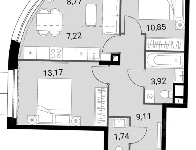 Квартира имеет удачную планировку: кухня, гостиная с выходом на балкон, три изолированные спальни, два санузла, прихожая.