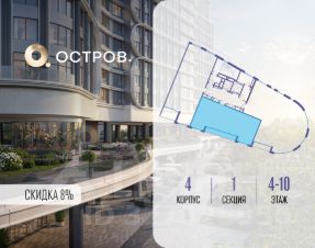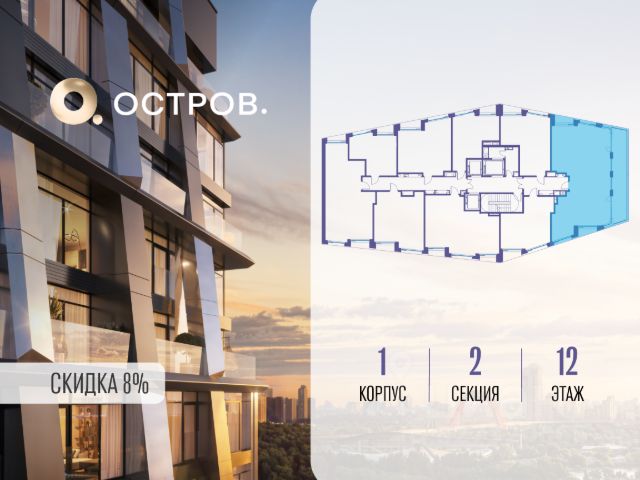 Продаётся видовая квартира свободной планировки общей площадью 75,7 м² в ЖК бизнес-класса "Остров" на берегу Москвы-реки.