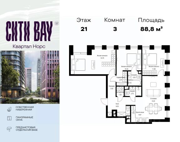 Прямая продажа от застройщика. Продаётся 3-комнатная квартира общей площадью 90.50 м² без отделки в ЖК Сити Бэй, квартале Пасифик, на 12-м этаже 59 этажного дома. Концепция жилого комплекса Сити Бэй - настоящий город в городе с отлично развитой инфраструктурой и собственной благоустроенной набережной. На территории жилого комплекса расположено пять кварталов - Атлантик, Пасифик, Индиан, Норс, Клиф. Жилой квартал Сити Бэй отличается оригинальной концепцией и выделяется среди других проектов такими характеристиками как: - Архитектура, - Виды из окон, - Природное окружение, вызывая гордость у жителей и восхищение у прохожих. Вся жизнь района Покровское-Стрешнево строится вокруг водных объектов: - Пойма реки Сходни с уникальной экосистемой, - Речка Химка и Химкинское водохранилище, - Москва-река, - Канал имени Москвы. Кругом вода, и местные с удовольствием этим пользуются. А сразу за рекой - центр водного спорта в Строгино с вейк-парком и яхт-Клубами. Помимо воды, здесь очень много зелени: - Рядом Сходненский ковш памятник природы, естественный амфитеатр глубиной 40 метров; - Парк при усадьбе Братцево с фруктовым садом; - Дубовая роща "Маяк", - Алешкинский лес; - Лесопарк Покровское-Стрешнево с пляжами и бобрами. Главные транспортные артерии района: - Волоколамское шоссе, - Таганско-Краснопресненская линия метро и МЦД-2. Всего за 20 минут можно добраться до центра на машине или метро, а МЦД связывает ЖК Сити Бэй с северными, восточными и юго-восточными районами. Компания MR предлагает своим клиентам специальные условия приобретения квартир в рамках программ ипотечного кредитования от банков-партнеров.