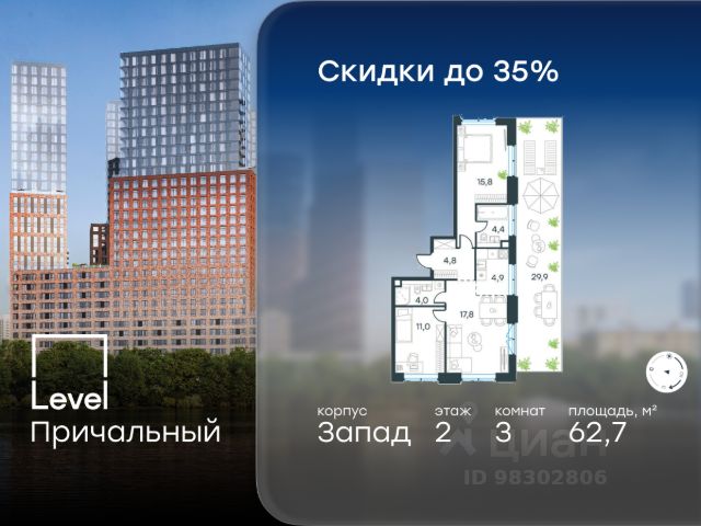 Цена указана с учётом скидки при 100%-й оплате, несубсидированной ипотеке, рассрочке (кроме программы "Рассрочка 0%"). Ключи в момент покупки! В готовом жилом комплексе на набережной Москвы-реки продается 3-комнатная квартира площадью 62,7 кв.м без отделки. Квартира расположена на 2 этаже 6 этажного корпуса " Запад" в жилом комплексе бизнес-класса Level Причальный (компания Level Group/Левел групп). Возможность купить машино-место в подземном паркинге. Отличная транспортная доступность - 7 мин. пешком до станции метро и МЦК "Шелепиха"; - 5 мин. на авто до ТТК; - 10 мин. на авто до Москва-Сити; - 13 мин. на авто до Садового кольца. Продуманный архитектурный проект - концепция от архитектурного бюро "Остоженка"; - окна высотой до 3,03 м и шириной до 4,3 м; - виды на МГУ, Москва-Сити, высотки на Смоленской и Кудринской площадях; - квартиры с террасой для отдыха и работы на свежем воздухе; - квартиры сдаются без отделки - прекрасная возможность для создания уникального интерьера. Технологии и безопасность - система приточной вентиляции обеспечит свежий воздух в квартирах; - собственные центральные водонагреватели - гарантия горячей воды в каждой квартире круглый год; - единый ключ доступа по всей территории ЖК; - высокоскоростные лифты OTIS. Благоустройство Дизайн внутренней территории Level Причальный разработан совместно со студией UpLand. Это уникальный двухуровневый двор с пространством для жителей любого возраста. Концепция игрового пространства верхнего яруса - каникулы на морском побережье. Дети будут в восторге от большого скалодрома и песочницы-пляжа площадью 280 м². Здесь находится безопасная площадка для малышей с фигурой кита-полосатика по центру. Верхний и нижний уровни двора соединяет 90-метровый мост-пергола. Дети смогут спускаться с него по горкам, будто ныряя в пучину океана. На нижнем уровне всё располагает к размеренному отдыху: прогулкам, беседам, релаксу на шезлонгах, творческим вечерам в амфитеатре или командным активностям с соседями. Все общественные зоны жилого комплекса, включая двор и лобби, имеют доступ к сети Wi-Fi. Внутренняя инфраструктура В жилом комплексе предусмотрен собственный торговый центр с супермаркетом, фитнес-центром и другими сервисами. Просторные входные группы с потолками до 4,4 м подчёркивают статусность дома. Для удобства предусмотрены мойки для лап животных, кладовые, гостевые санузлы и теплый подземный паркинг на 694 машино-места. Инфраструктура района Level Причальный расположен в районе Хорошёво-Мнёвники, одном из самых экологически чистых и престижных районов СЗАО Москвы. В 15-минутной доступности на авто - 50 детских садов, 22 школы, 5 торговых центров, десятки супермаркетов и фитнес-клубов. И совсем скоро Шелепихинская набережная, на которой расположен жилой комплекс, приобретет новый облик и станет одним из главных мест притяжения резидентов Level Причальный. Продам 3-комнатную квартиру в новостройке на проезде Причальный в Москве.