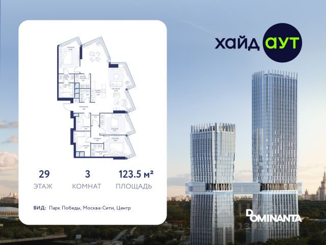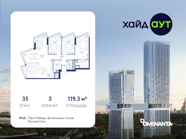 Прямая продажа от застройщика! Продается 3-комнатная квартира площадью 94.3 кв.м. на 25-м этаже 34-этажного дома в жилом комплексе ХАЙДАУТ с панорамными видами: Парк Победы, Долина реки Сетунь, МГУ, Москва-Сити, Воробьевы горы. Высота потолков 3,25 м. В ХАЙДАУТ доступны различные условия покупки — от специальных предложений при полной оплате до комфортных программ рассрочки и индивидуальных ипотечных решений. ХАЙДАУТ — премиальный проект компании Dominanta. Это новый уровень жизни и комфорта без компромиссов. Две башни — 34 и 49 этажей — открывают захватывающие виды на Москву. Архитектурной доминантой проекта становится мост, соединяющий башни на высоте 80 метров. Закрытая территория, охрана 24/7, зона экстренной безопасности на подземном уровне, система пожаротушения. На мосту между башнями на 22-м этаже находится общественное пространство SocialHUB — предусмотрено 16 комфортных пространств для работы, отдыха и развлечений с панорамными видами и клубным форматом доступа. Концепция благоустройства ХАЙДАУТ — баланс между природой и технологичным городом будущего. На территории сада предусмотрены 15 зон для отдыха, работы, спорта и детей. Знаковым местом станет центральная площадь с амфитеатром и водопадом — сочетание камней, растений и струящейся воды создает идеальный баланс с природой. Застройщик АО "СЗ "ХАЙДАУТ", ИНН 7729058636, ОГРН 1027739319420. Проектная декларация на сайте наш.дом.рф. Предложение не является публичной офертой.