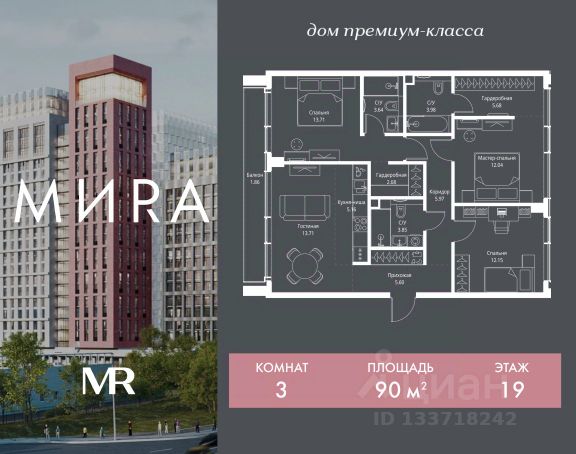 Продаются 3-к апартаменты площадью 50.6 кв.м. на 10-м этаже 33 этажного дома в ЖК "Мираполис" от ГК ОСНОВА. МИРАПОЛИС - проект для тех, кому важно, чтобы под рукой было всё для работы, отдыха и жизни. Проект состоит из четырех башен с авторскими стеклянными фасадами и lounge-rooftop под открытым небом. С высоты птичьего полета резиденты будут наслаждаться видами на город и расположенные рядом парки: "Лосиный остров", "Сокольники", "Ботанический сад", "Сад будущего" и "ВДНХ". МИРАПОЛИС расположен в 3 минутах пешком от МЦК "Ростокино". За 5 минут - можно добраться до ст.м. ВДНХ на машине, а быстрый выезд на главные транспортные магистрали (ТТК и Проспект мира) позволит доехать на личном авто до центра Москвы за полчаса. В просторных лобби с дизайнерской отделкой продуман круглосуточный консьерж-сервис, приватные зоны с мягкой мебелью и комнаты для мытья лап питомцам. Панорамные окна и потолки высотой 3,1 м, а система "умный дом" значительно упростит жизнь резидентам и автоматизирует бытовые процессы. Концептуальный проект предлагает все преимущества бизнес-класса: подземный паркинг, торговый центр и супермаркет, фитнес-клуб, бассейн и SPA, офисы и коворкинги - всё для полноценной и комфортной жизни в столице. 3-комнатная квартира в новостройке на проспекте Мира в Москве.