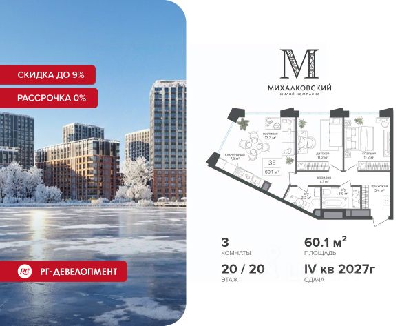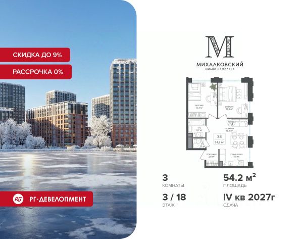 Новогодняя скидка 9% при покупке квартиры! Продаётся 3-к квартира 63,5 кв.м. в ЖК "Михалковский" на 16-м этаже 18 этажного дома. Компания "РГ-Девелопмент" предоставляет новогоднюю скидку на квартиры в жилом комплексе. Акция действительна с 12.09.2024 по 31.12.2025 включительно. Для того чтобы воспользоваться предложением, необходимо подписать договор на приобретение недвижимости до 31.12.2025 включительно. Рассрочка 0% + Скидка 5%. При приобретении дольщиком квартиры в любом из двух данных корпусов с использованием способа оплаты "Рассрочка 0%", у покупателя также есть право воспользоваться скидкой в размере 5% от полной стоимости квартиры. Условия программы рассрочки: Первый платеж составляет 20% от стоимости объекта и вносится при заключении ДДУ. Второй платеж в размере 20% от стоимости объекта вносится по истечении 12 месяцев со дня подписания ДДУ. Оставшаяся сумма, в размере 60%, выплачивается за месяц до планового срока ввода ЖК в эксплуатацию, то есть не позднее 31.05.2027. Действует на приобретение квартир в корп. 2, 7. Действует программа "Растет семья - растет и квартира". Прямая продажа от застройщика! Старт продаж новых корпусов. Квартиры без отделки. Срок сдачи IV кв. 2027г. Особенности проекта: Завораживающие виды Красивое благоустройство Уникальная локация для Москвы (рядом Головинский парк, пруды, усадьба Михалково) Рядом с центром В проекте присутствует: архитектура голландского бюро MLA+, зеленые зоны, транспортная доступность, благоустроенная территория, подземный паркинг, детский сад и выход на Головинский парк с пятью прудами. Название комплекса указывает на одну из его черт - соседство с имением Михалково. Позвольте себе жить в месте, где проводили свой досуг династии Дашковых и Паниных.