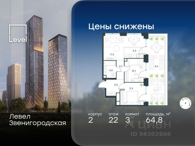 Цена указана с учётом скидки при 100%-й оплате, несубсидированной ипотеке, рассрочке (кроме программы "Рассрочка 0%"). В жилом квартале продаётся 3-комнатная квартира площадью 79.50 кв.м с предчистовой отделкой. Квартира расположена на 7 этаже 48 этажного корпуса 1 в жилом комплексе комфорт класса Левел Звенигородская (компания Level Group/Левел групп). Отличная транспортная доступность - 5 мин. пешком до метро "Звенигородская" (откроется к окончанию строительства); - 18 мин. пешком до станции МЦК "Хорошёво" и станции БКЛ "Народное ополчение"; - 4 мин. на авто до ТТК; - 8 мин. на авто до Садового кольца; - 15 мин. на авто до Кремля. Продуманный архитектурный проект - Концепция от студии Станислава Михаловского, в основу которой легло единение природы и города; - Двухкамерные стеклопакеты в окнах, алюминиевый и ПВХ профиль - в квартирах тепло зимой и прохладно летом; - С верхних этажей открываются панорамные виды на город, Москву-реку, "Москва-Сити" и Москворецкий парк; - Лобби со всеми удобствами: окна в пол, высокие потолки до 4,7 м, лаунж-зоны, колясочные, гостевые санузлы и мойки для лап животных; - Централизованные водонагреватели гарантируют круглогодичную подачу горячей воды в каждую квартиру. Благоустройство Концепция благоустройства разработана совместно с бюро UNK landscape. Высота башен приближается к 200 метрам - они словно касаются неба. Небесный простор проецируется на территорию двора с помощью подсветки, визуально увеличивая пространство и отражаясь в авторских элементах архитектуры. На территории площадью 0,45 га расположатся: - "Облако событий" - место встреч и общения; - "Облако спорта" - всё для поддержания себя в форме; - "Облако принятия решений" - пространство для работы на свежем воздухе; - "Облако спокойствия" - для отдыха в тишине природы; - "Облако игр" - площадки для подростков и самых маленьких. Инфраструктура В жилом комплексе откроется 21 коммерческое помещение: продуктовые лавки, кафе, салоны красоты, службы доставки и творческие студии. Этап 1 включает строительство двухуровневого подземного паркинга. Всего здесь расположится 351 машино-место, включая семейные места, и 264 кладовых помещения. В распоряжении жителей развитая инфраструктура района: 15 супермаркетов, 5 спортивных объектов, 9 медучреждений, 7 детских садов, 4 школы, 3 благоустроенных парка - всё в шаговой доступности. Инженерия Комфортное перемещение внутри домов будут обеспечивать надёжные лифты с доступом в паркинг с жилых этажей. В каждом корпусе предусмотрено до шести кабин, включая сервисные лифты. Попасть на территорию комплекса можно только по единому ключу доступа. Видеонаблюдение установлено на входах в подъезды, в лобби, в общих зонах, на въезде в паркинг. Гости смогут связаться с жителями дома через входные видеопанели, а управлять доступом на территорию можно через видеодомофон или приложение на телефоне.