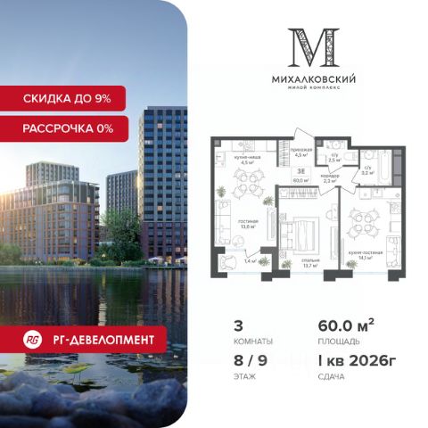 Ипотека для каждого! Полная стоимость кредита от 11,578% до 22,490%. Ставка от 0,11% в АО "Альфа-Банк" фиксируется на 1 год с даты заключения кредитного договора, далее полная стоимость кредита от 25,819% до 28,767% ставка 21,59% до окончания срока кредитования. Первоначальный взнос — от 20% от стоимости квартиры. Срок кредитования — от 3 до 30 лет. Скидка 9% при покупке квартиры! Продаётся 3-к квартира 60,3 кв.м. в ЖК "Михалковский" на 7-м этаже 20 этажного дома. Компания "РГ-Девелопмент" предоставляет скидки на квартиры в жилом комплексе. Акция действительна с 12.09.2024 г. до 31.10.25г. включительно. Для того чтобы воспользоваться предложением, необходимо подписать договор на приобретение недвижимости до 31.10.25г., включительно. Рассрочка 0% + Скидка 5%. При приобретении дольщиком квартиры в любом из двух данных корпусов с использованием способа оплаты "Рассрочка 0%", у покупателя также есть право воспользоваться скидкой в размере 5% от полной стоимости квартиры. Условия программы рассрочки: Первый платеж составляет 20% от стоимости объекта и вносится при заключении ДДУ. Второй платеж в размере 20% от стоимости объекта вносится по истечении 12 месяцев со дня подписания ДДУ. Оставшаяся сумма, в размере 60%, выплачивается за месяц до планового срока ввода ЖК в эксплуатацию, то есть не позднее 31.05.2027. Действует на приобретение квартир в корп. 2, 7. Действует программа "Растет семья - растет и квартира". Прямая продажа от застройщика! Старт продаж новых корпусов. Квартиры без отделки. Срок сдачи IV кв. 2027г. Особенности проекта: Завораживающие виды Красивое благоустройство Уникальная локация для Москвы (рядом Головинский парк, пруды, усадьба Михалково) Рядом с центром В проекте присутствует: архитектура голландского бюро MLA+, зеленые зоны, транспортная доступность, благоустроенная территория, подземный паркинг, детский сад и выход на Головинский парк с пятью прудами. Название комплекса указывает на одну из его черт - соседство с имением Михалково. Позвольте себе жить в месте, где проводили свой досуг династии Дашковых и Паниных. 3-комнатная квартира в новостройке станция Лихоборы (МЦК).