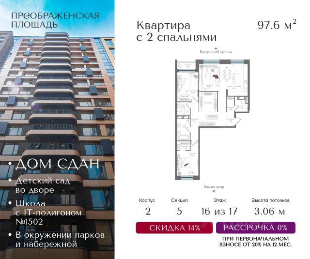 Рассрочка 0% от застройщика. Первоначальный взнос от 20%. Предложение действует до 31 января 2026 года Квартира на 17 этаже в жилом комплексе премиум-класса "Преображенская площадь". Общая площадь: 99.5 кв.м. Проект премиум-класса в историческом районе Москвы. До метро "Преображенская площадь" 3 минуты пешком. Квартиры сдаются без отделки и в свободной планировке, чтобы жители могли оформить пространство с учетом своей индивидуальности. Высота потолков от 3,15м, широкоформатное остекление, 3-5 квартир на этаже. Система Умный дом. Дизайнерские лобби. Внутренний двор 1,5 га функциональное и безопасное пространство для игр, работы и занятий спортом. Пешеходный променад для прогулок. Дома переменной этажности. Есть подземный паркинг. Жилой комлекс находится в окружении парков Сокольники, Черкизовский, Измайловский, заповедника Лосиный остров и ВДНХ, а также вблизи пешеходной набережной. Комфортная удаленность от центра: 7 минут на автомобиле до ТТК, 8 минут до Садового кольца, 25 минут до Кремля.