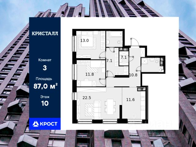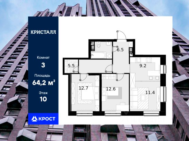 Трёхкомнатная квартира площадью 74,8 кв.м. на 6 этаже дома бизнес-класса "Трилогия Кристалл". Жилой комплекс Трилогия Кристалл комфорт в сердце Хорошево-Мнёвников. Удобное расположение и транспортная доступность. Трилогия Кристалл расположен в престижном районе Хорошево-Мнёвники, на улице Генерала Глаголева, всего в нескольких минутах от живописного Серебряного бора и набережной Москвы-реки. Из окон открываются панорамные виды на воду и зелёные зоны, создавая ощущение гармонии с природой. Автомобильная доступность • Звенигородское шоссе и проспект Маршала Жукова быстрый выезд в любую часть города. • 7 км до ТТК, 9 км до МКАД, 10 км до Садового кольца. • Общественный транспорт: • Ближайшая станция метро "Народное ополчение" (2 км). Добраться можно пешком или на автобусе. • В пешей доступности строятся 3 новые станции метро, что повысит транспортную связанность района. Инфраструктура: всё для жизни в шаговой доступности Комплекс входит в состав масштабного квартала Юнион Парк (40 га) это современная городская среда с продуманной инфраструктурой. Образование и развитие: • Лучшие школы Москвы: 1515, 1517, 138, Курчатовская школа. • Детские сады. • Музыкальная школа им. В. В. Андреева. Медицина и спорт: • Поликлиника "Семейный доктор", медцентр "Мед-Лайт", стоматология. • Спорткомплекс "Серебряный" с бассейном, тренажерным залом и солярием. Магазины и рестораны: • Премиальные магазины: "Азбука вкуса", "ВкусВилл", "Лента", "Магнолия". • Рестораны и кафе. Футуристичная архитектура с продуманным комфортом Трилогия Кристалл это уникальный дизайн и эргономичные планировки: Внешний облик: • Кристаллическая архитектура с панорамными эркерами и фасадами в оттенках горького шоколада. • Трехуровневая структура, где на верхнем ярусе вы увидите геометрические эркеры с панорамным остеклением, на среднем уровне расположены квартиры с окнами на 1-2 стороны, а на нижнем отделка австрийским клинкерным кирпичом. Внутреннее пространство: • Светлые входные группы с лаунж-зонами для отдыха и мероприятий. • Подземный паркинг (по машиноместу на квартиру) и кладовые для хранения. • Закрытые дворы с спортивными зонами: • Теннисный корт. • Площадки для воркаута. • Беговые дорожки. • Поле для игровых видов спорта. Квартиры с продуманными планировками • 14 комнатные варианты. • Высокие потолки и панорамное остекление для максимальной инсоляции. • Ровные стены и черновая/чистовая отделка на выбор. • Готовые решения для комфортного заезда. Продам 3-комнатную квартиру в новостройке на улице Генерала Глаголева в Москве.