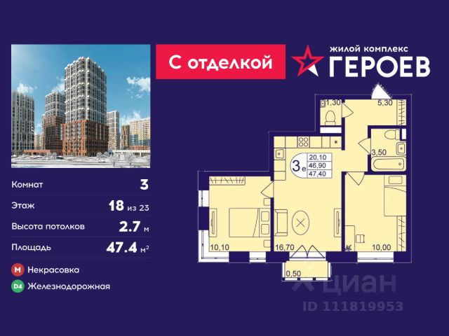 Продаётся 3-комнатная квартира 47.4 кв. м. в жилом комплексе "Героев" в Балашихе, Железнодорожный. Квартира расположена на 18 этаже 610 корпуса. Все квартиры представлены с чистовой отделкой. Вам не нужно тратить время и дополнительные финансы на ремонт или жить в шуме строительных работ - достаточно перевести свои вещи, расставить мебель и всё готово! Жилой квартал "Героев" - это уютный проект для семей с детьми. Всего 40 минут до центра Москвы. В квартале созданы все условия для досуга всех возрастов: игровые и спортивные площадки, места для отдыха и прогулок, магазины, кафе и пункты выдачи. За 15 минут можно дойти от дома до Ольгинского лесопарка - популярного места для прогулок и отдыха на свежем воздухе. Здесь приятно гулять всей семьёй, заниматься спортом или устроить пикник в выходной день. Преимущества: Квартира с готовой отделкой. Пространство полностью подготовлено для жизни: не нужно тратить время и деньги на ремонт или ждать его окончания. После получения ключей достаточно расставить мебель - и можно сразу заезжать и жить. Продуманные и светлые планировки. Просторные кухни-гостиные создают комфортное пространство для отдыха и встреч с близкими. В квартирах предусмотрены удобные гардеробные, благодаря чему легко поддерживать порядок и не перегружать комнаты шкафами. Увеличенное остекление. Большие окна наполняют квартиру естественным светом в течение всего дня, создавая ощущение простора и уюта, а также визуально расширяя пространство и делая интерьер более воздушным. Пешая доступность до станции Железнодорожная (МЦД-4) - дорога займёт не более 30 минут до центра Москвы: станции метро "Курская", "Площадь Ильича" или ТПУ Нижегородская.