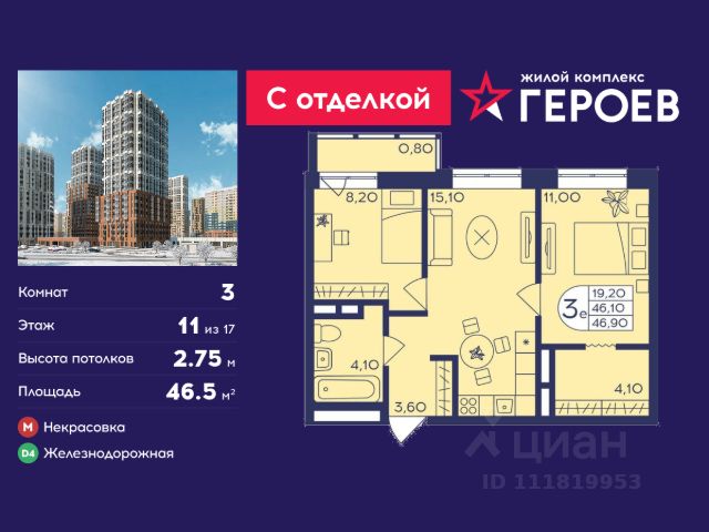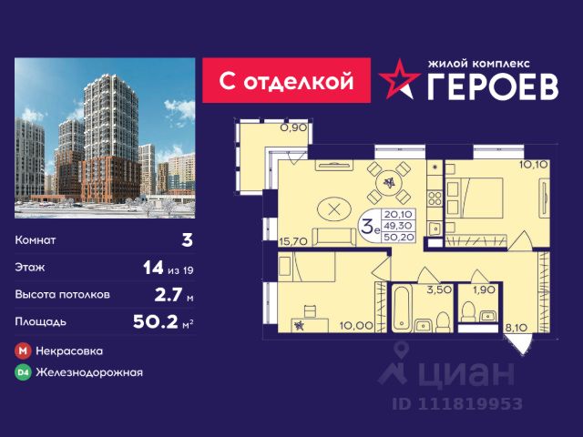 Продаётся 3-комнатная квартира 50.1 кв. м. в жилом комплексе "Героев" в Балашихе, Железнодорожный. Квартира расположена на 11 этаже 610 корпуса. Все квартиры представлены с чистовой отделкой. Вам не нужно тратить время и дополнительные финансы на ремонт или жить в шуме строительных работ - достаточно перевести свои вещи, расставить мебель и всё готово! Жилой квартал "Героев" - это уютный проект для семей с детьми. Всего 40 минут до центра Москвы. В квартале созданы все условия для досуга всех возрастов: игровые и спортивные площадки, места для отдыха и прогулок, магазины, кафе и пункты выдачи. За 15 минут можно дойти от дома до Ольгинского лесопарка - популярного места для прогулок и отдыха на свежем воздухе. Здесь приятно гулять всей семьёй, заниматься спортом или устроить пикник в выходной день. Преимущества: Квартира с готовой отделкой. Пространство полностью подготовлено для жизни: не нужно тратить время и деньги на ремонт или ждать его окончания. После получения ключей достаточно расставить мебель - и можно сразу заезжать и жить. Продуманные и светлые планировки. Просторные кухни-гостиные создают комфортное пространство для отдыха и встреч с близкими. В квартирах предусмотрены удобные гардеробные, благодаря чему легко поддерживать порядок и не перегружать комнаты шкафами. Увеличенное остекление. Большие окна наполняют квартиру естественным светом в течение всего дня, создавая ощущение простора и уюта, а также визуально расширяя пространство и делая интерьер более воздушным. Пешая доступность до станции Железнодорожная (МЦД-4) - дорога займёт не более 30 минут до центра Москвы: станции метро "Курская", "Площадь Ильича" или ТПУ Нижегородская.