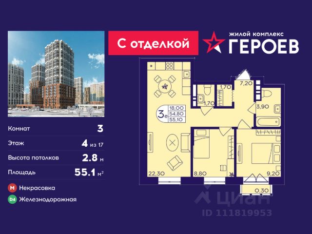 Продаётся 3-комнатная квартира 55.1 кв. м. в жилом комплексе "Героев" в Балашихе, Железнодорожный. Квартира расположена на 4 этаже 413 корпуса. Все квартиры представлены с чистовой отделкой. Вам не нужно тратить время и дополнительные финансы на ремонт или жить в шуме строительных работ - достаточно перевести свои вещи, расставить мебель и всё готово! Жилой квартал "Героев" - это уютный проект для семей с детьми. Всего 40 минут до центра Москвы. В квартале созданы все условия для досуга всех возрастов: игровые и спортивные площадки, места для отдыха и прогулок, магазины, кафе и пункты выдачи. За 15 минут можно дойти от дома до Ольгинского лесопарка - популярного места для прогулок и отдыха на свежем воздухе. Здесь приятно гулять всей семьёй, заниматься спортом или устроить пикник в выходной день. Преимущества: Квартира с готовой отделкой. Пространство полностью подготовлено для жизни: не нужно тратить время и деньги на ремонт или ждать его окончания. После получения ключей достаточно расставить мебель - и можно сразу заезжать и жить. Продуманные и светлые планировки. Просторные кухни-гостиные создают комфортное пространство для отдыха и встреч с близкими. В квартирах предусмотрены удобные гардеробные, благодаря чему легко поддерживать порядок и не перегружать комнаты шкафами. Увеличенное остекление. Большие окна наполняют квартиру естественным светом в течение всего дня, создавая ощущение простора и уюта, а также визуально расширяя пространство и делая интерьер более воздушным. Пешая доступность до станции Железнодорожная (МЦД-4) - дорога займёт не более 30 минут до центра Москвы: станции метро "Курская", "Площадь Ильича" или ТПУ Нижегородская.