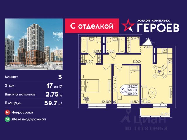 Продаётся 3-комнатная квартира 59.7 кв. м. в жилом комплексе "Героев" в Балашихе, Железнодорожный. Квартира расположена на 17 этаже 407 корпуса. Все квартиры представлены с чистовой отделкой. Вам не нужно тратить время и дополнительные финансы на ремонт или жить в шуме строительных работ - достаточно перевести свои вещи, расставить мебель и всё готово! Жилой квартал "Героев" - это уютный проект для семей с детьми. Всего 40 минут до центра Москвы. В квартале созданы все условия для досуга всех возрастов: игровые и спортивные площадки, места для отдыха и прогулок, магазины, кафе и пункты выдачи. За 15 минут можно дойти от дома до Ольгинского лесопарка - популярного места для прогулок и отдыха на свежем воздухе. Здесь приятно гулять всей семьёй, заниматься спортом или устроить пикник в выходной день. Преимущества: Квартира с готовой отделкой. Пространство полностью подготовлено для жизни: не нужно тратить время и деньги на ремонт или ждать его окончания. После получения ключей достаточно расставить мебель - и можно сразу заезжать и жить. Продуманные и светлые планировки. Просторные кухни-гостиные создают комфортное пространство для отдыха и встреч с близкими. В квартирах предусмотрены удобные гардеробные, благодаря чему легко поддерживать порядок и не перегружать комнаты шкафами. Увеличенное остекление. Большие окна наполняют квартиру естественным светом в течение всего дня, создавая ощущение простора и уюта, а также визуально расширяя пространство и делая интерьер более воздушным. Пешая доступность до станции Железнодорожная (МЦД-4) - дорога займёт не более 30 минут до центра Москвы: станции метро "Курская", "Площадь Ильича" или ТПУ Нижегородская.
