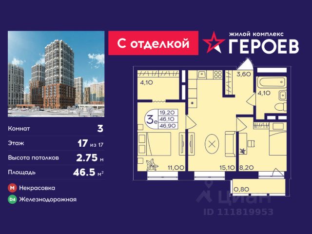 Продаётся 3-комнатная квартира 50.5 кв. м. в жилом комплексе "Героев" в Балашихе, Железнодорожный. Квартира расположена на 17 этаже 611 корпуса. Все квартиры представлены с чистовой отделкой. Вам не нужно тратить время и дополнительные финансы на ремонт или жить в шуме строительных работ - достаточно перевести свои вещи, расставить мебель и всё готово! Жилой квартал "Героев" - это уютный проект для семей с детьми. Всего 40 минут до центра Москвы. В квартале созданы все условия для досуга всех возрастов: игровые и спортивные площадки, места для отдыха и прогулок, магазины, кафе и пункты выдачи. За 15 минут можно дойти от дома до Ольгинского лесопарка - популярного места для прогулок и отдыха на свежем воздухе. Здесь приятно гулять всей семьёй, заниматься спортом или устроить пикник в выходной день. Преимущества: Квартира с готовой отделкой. Пространство полностью подготовлено для жизни: не нужно тратить время и деньги на ремонт или ждать его окончания. После получения ключей достаточно расставить мебель - и можно сразу заезжать и жить. Продуманные и светлые планировки. Просторные кухни-гостиные создают комфортное пространство для отдыха и встреч с близкими. В квартирах предусмотрены удобные гардеробные, благодаря чему легко поддерживать порядок и не перегружать комнаты шкафами. Увеличенное остекление. Большие окна наполняют квартиру естественным светом в течение всего дня, создавая ощущение простора и уюта, а также визуально расширяя пространство и делая интерьер более воздушным. Пешая доступность до станции Железнодорожная (МЦД-4) - дорога займёт не более 30 минут до центра Москвы: станции метро "Курская", "Площадь Ильича" или ТПУ Нижегородская.