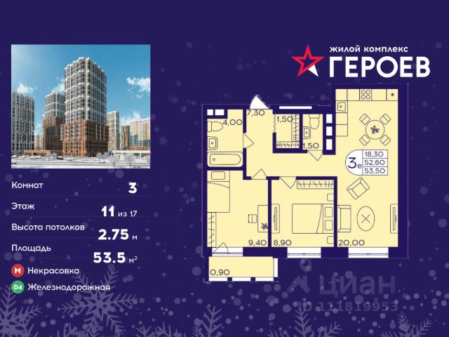 Продаётся 3-комнатная квартира в формате евро 53.50 кв. м. в жилом комплексе "Героев" в Балашихе, Железнодорожный. Квартира расположена на 11 этаже 410 корпуса. В наличии квартиры с отделкой. Всего 40 минут до центра Москвы. При покупке квартиры в сданном доме ключи выдаются сразу! Жилой квартал "Героев" - это уютный проект для семей с детьми. В квартале созданы все условия для досуга всех возрастов: игровые и спортивные площадки, места для отдыха и прогулочные зоны. За 15 минут можно дойти от дома до Ольгинского лесопарка, популярного места для отдыха на свежем воздухе. На территории жилого комплекса уже открыт детский сад на 250 мест и началось строительство еще одного - для 220 малышей, а также школы для 1320 учеников. Рядом работают магазины, кафе, супермаркеты, пункты выдачи. Преимущества: • В уютных светлых квартирах с просторными кухнями-гостиными удобно встречать гостей и проводить время наедине друг с другом. • Благодаря увеличенному остеклению в комнатах много света. • Квартиры продаются с отделкой, можно заселяться сразу после получения ключей.
