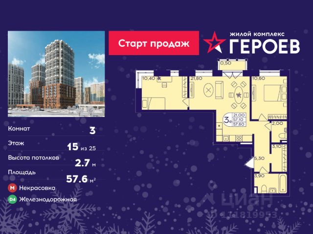 Продаётся 3-комнатная квартира в формате евро 57.40 кв. м. в жилом комплексе "Героев" в Балашихе, Железнодорожный. Квартира расположена на 3 этаже 611 корпуса. В наличии квартиры с отделкой. Всего 40 минут до центра Москвы. При покупке квартиры в сданном доме ключи выдаются сразу! Жилой квартал "Героев" - это уютный проект для семей с детьми. В квартале созданы все условия для досуга всех возрастов: игровые и спортивные площадки, места для отдыха и прогулочные зоны. За 15 минут можно дойти от дома до Ольгинского лесопарка, популярного места для отдыха на свежем воздухе. На территории жилого комплекса уже открыт детский сад на 250 мест и началось строительство еще одного - для 220 малышей, а также школы для 1320 учеников. Рядом работают магазины, кафе, супермаркеты, пункты выдачи. Преимущества: • В уютных светлых квартирах с просторными кухнями-гостиными удобно встречать гостей и проводить время наедине друг с другом. • Благодаря увеличенному остеклению в комнатах много света. • Квартиры продаются с отделкой, можно заселяться сразу после получения ключей.