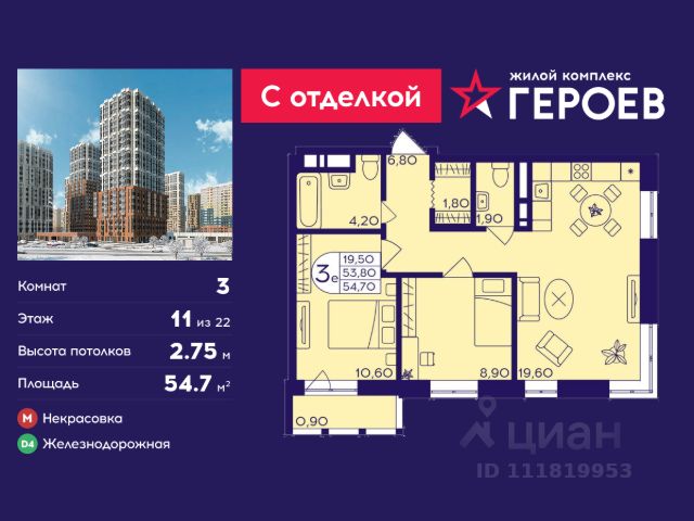 Продаётся 3-комнатная квартира 54.7 кв. м. в жилом комплексе "Героев" в Балашихе, Железнодорожный. Квартира расположена на 11 этаже 410 корпуса. Все квартиры представлены с чистовой отделкой. Вам не нужно тратить время и дополнительные финансы на ремонт или жить в шуме строительных работ - достаточно перевести свои вещи, расставить мебель и всё готово! Жилой квартал "Героев" - это уютный проект для семей с детьми. Всего 40 минут до центра Москвы. В квартале созданы все условия для досуга всех возрастов: игровые и спортивные площадки, места для отдыха и прогулок, магазины, кафе и пункты выдачи. За 15 минут можно дойти от дома до Ольгинского лесопарка - популярного места для прогулок и отдыха на свежем воздухе. Здесь приятно гулять всей семьёй, заниматься спортом или устроить пикник в выходной день. Преимущества: Квартира с готовой отделкой. Пространство полностью подготовлено для жизни: не нужно тратить время и деньги на ремонт или ждать его окончания. После получения ключей достаточно расставить мебель - и можно сразу заезжать и жить. Продуманные и светлые планировки. Просторные кухни-гостиные создают комфортное пространство для отдыха и встреч с близкими. В квартирах предусмотрены удобные гардеробные, благодаря чему легко поддерживать порядок и не перегружать комнаты шкафами. Увеличенное остекление. Большие окна наполняют квартиру естественным светом в течение всего дня, создавая ощущение простора и уюта, а также визуально расширяя пространство и делая интерьер более воздушным. Пешая доступность до станции Железнодорожная (МЦД-4) - дорога займёт не более 30 минут до центра Москвы: станции метро "Курская", "Площадь Ильича" или ТПУ Нижегородская.