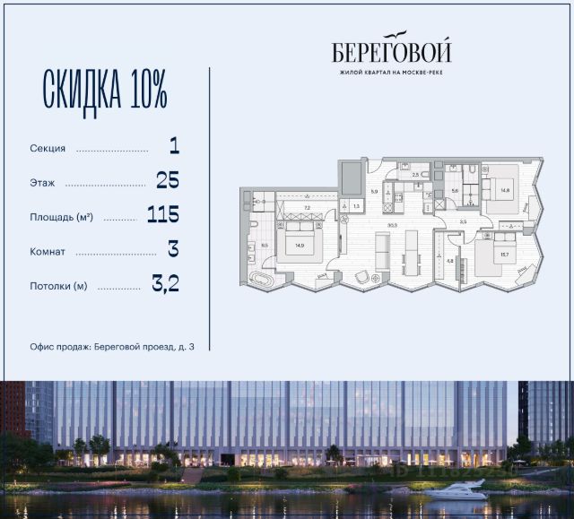 Река. Парк. Сити. Готовый дом в идеальном месте. Продается 3-комнатная квартира на 9 этаже с панорамным остеклением и видом на Береговой пр-д. Береговой — квартал-курорт в центре столицы. Готовый дом на первой линии Москвы-реки. Пешеходная набережная начинается прямо от дома — никаких дорог между вами и рекой. Уникальное сочетание природы парка Фили и ритма Сити. Ключи от нового образа жизни в Береговом: • 12 террас на крышах — ваши виды на Москву с высоты птичьего полета • Пешеходная набережная прямо у дома — ни одной машины между вами и рекой • Лобби с камином, переговорной и консьерж-сервисом • Флагманский Encore Fitness — самый большой в сети (4700 м²) с бассейном, термами и спа-комплексом • Детство на берегу Москвы-реки — в рамках проекта будут построены две школы и детский сад рядом с домом • Гастрономическая набережная: рестораны и премиум-сервисы откроются на первых этажах • Причал "Береговой" рядом с домом — путешествуйте по городу, пока другие стоят в пробках • Безопасность и уединение: контроль доступа на территорию, видеонаблюдение и круглосуточная диспетчерская • Двухуровневый подземный паркинг и кладовые Безупречная квартира для жизни: • Пространство света и воздуха: панорамные окна и высокие потолки 3.2 м • Технологии: центральное кондиционирование и роботизированная система очистки фасадов — вид из окна всегда будет идеальным • Совершенство планировки: просторная кухня-гостиная, минимум коридоров, максимум полезной площади • Квартира без отделки — возможность раскрыть преимущества планировки в вашем уникальном интерьере. Или выбирайте свою версию идеального дома в коллекции планировок: • С изолированными спальнями • Мастер-спальнями с гардеробными и ванными • Видовые ванные комнаты • Функциональные постирочные Эксклюзивные лоты: • Пентахусы с приватными террасами • Двухуровневые пентхаусы Локация, о которой мечтают 15 минут до Сити на машине — и вы в эпицентре деловой жизни. Две станции метро в пешей доступности — когда каждая минута на счету. Утром — пробежка по парку Фили, вечером — прогулка на велосипеде вдоль реки, выходные — водный спорт в Крылатском. Речные трамвайчики вместо такси, зеленые парки и благоприятная экология — привилегии престижного ЗАО Москвы. Условия покупки: выгодные программы покупки от застройщика, специальные условия при полной оплате. Оставляйте заявку на персональную презентацию в шоу-руме.
