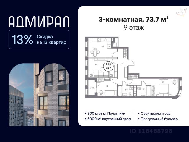 Указанная акционная стоимость доступна при 100% оплате или ипотеке без субсидирования. Цена действует до 16.02.2026 23:59:59. Стоимость без акции 35094600. Старт продаж! Продаётся 3-комнатная квартира от застройщика ГК "КОРТРОС" в жилом комплексе бизнес-класса ULTIMAcity. Квартира расположена на 46 этаже 52 этажного корпуса 2. Общая площадь 72,36 м². Без отделки. В квартире: • Два сан. узла ULTIMAcity — жилой комплекс бизнес-класса в перспективном районе на юго-востоке Москвы. На его территории появятся 9 башен на 756 этажей, двухуровневый подземный паркинг, собственная инфраструктура, включая детский сад и школу. Всего девелопер благоустроит территорию в 2,6 га. Ближайшая станция метро — "Южный порт". Она откроется в 2028 году и будет находиться в 2-х минутах ходьбы. А прямо напротив расположится остановка водного автобуса-электрохода "Синичка". Дорога от квартала будет удобна и для автомобилистов: - до Кремля — 12 км - до МКАД — 12 км - до выезда на ТТК — 3 км - до Садового кольца — 8 км В двух корпусах первой очереди ULTIMAcity этажностью 45 и 52 реализуется 1 079 квартир с продуманными, рациональными планировочными решениями. В ассортиментной линейке представлены однокомнатные квартиры от 28,2 до 61 кв. м, двухкомнатные лоты от 44,3 до 95,4 кв. м, квартиры с тремя (71 — 115,57 кв. м) и четырьмя спальнями (106,6 — 114,97 кв. м). В экспозиции также есть квартиры с террасами, лоджиями, тремя и четырьмя санузлами, а также с функциональными нишами-кладовыми на кухнях. Запроектированы и эксклюзивные двухуровневые резиденции со вторым светом, в том числе с видом на Москву-реку, площадью от 77,7 до 141,9 кв. м. В рамках проекта запланировано строительство 9 корпусов, школы на 500 учащихся и детского сада на 225 мест. Еще будет создана продуманная инфраструктура для жителей: детские и спортивные площадки, амфитеатр для мероприятий, беседки и теплицы для садоводства, коворкинг, детский клуб и ресторан с открытой террасой. Доступ в жилой комплекс осуществляется по биометрическому контролю - Face ID. Вокруг квартала будет приватная территория с видеонаблюдением и консьерж-сервисом 24/7. Лобби корпусов будут иметь двойные выходы: на улицу и во внутренний закрытый двор.