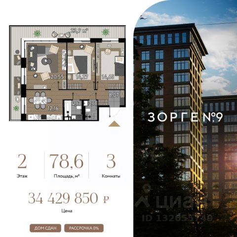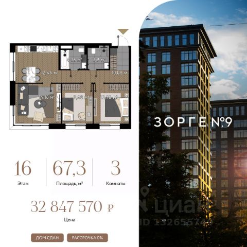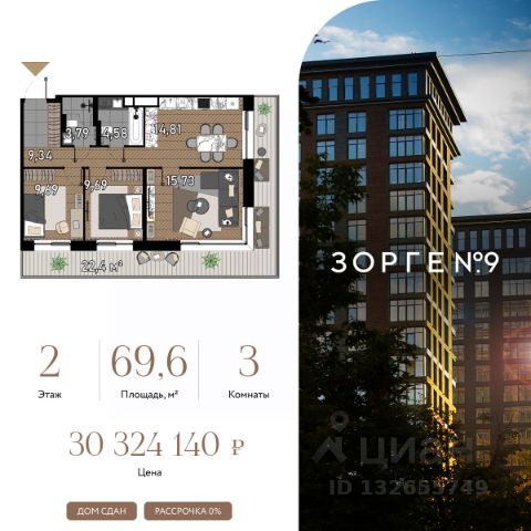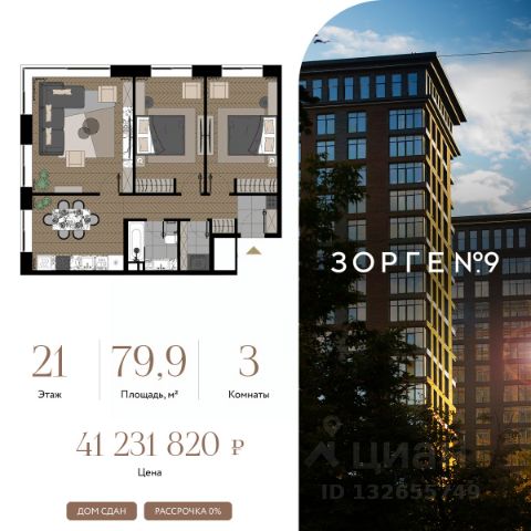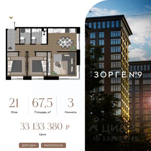 "Зорге 9" — готовый квартал апартаментов с премиальными сервисами на Ходынке. В трех корпусах с панорамными окнами предусмотрены уникальные форматы площадей, удовлетворяющие самый взыскательный вкус. В 7 минутах ходьбы от "Зорге 9" расположены 4 станции метро: Полежаевская", "Хорошевская", "Зорге" и "Хорошево". До делового центра "Москва-Сити" 10 минут на автомобиле. Простота форм, строгие линии, панорамные окна, архитектурное освещение и арт-объекты поддержат атмосферу роскоши и комфортной жизни на Ходынке. Именно за яркую архитектуру апарт-комплекс "Зорге 9" получил престижную международную премию European Property Awards. Комплекс полностью введен в эксплуатацию. "Зорге 9" — территория инноваций. Высокие потолки и панорамные окна Guardian ClimaGuard Solar с энергоэффективным "умным" напылением. Предусмотрен ряд премиальных сервисов: вход по Face ID, мобильное приложение резидента, дающее доступ ко всем услугам в один клик, 500 видеокамер на территории, двухуровневый подземный паркинг с автоматическим шлагбаумом, зарядкой для электромобилей, велосейфом и станцией подкачки шин. В "Зорге 9" можно рассмотреть варианты площадей от 27 до 81 кв. м, свободной планировки, с окнами в пол и высотой потолков до 4,3 м, а также уникальные форматы пространств. Апартаменты с террасами позволят создать дополнительное рабочее пространство или зону отдыха на свежем воздухе, а тканевые маркизы помогут создать тень и повысить уровень приватности. Угловое остекление станет особой изюминкой и украсит любой интерьер. На последних этажах предусмотрены пентхаусы с каминами и выходами на кровлю: от 150 кв. м жилья high-уровня с максимальным уровнем инсоляции — на потолках в пентхаусах появятся так называемые "световые фонари". "Зорге 9" СДАН, все корпуса введены в эксплуатацию. Продается 3-комнатная квартира с отделкой от застройщика рядом с метро Полежаевская.