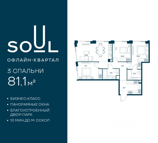 Цены указаны с условием 100% оплаты и стандартной ипотеки. Прямая продажа от застройщика! Продается 3-к. квартира номер 513 общей площадью 90.8 кв.м. на 14-м этаже 18 этажного дома, Корпус 8. Без отделки. Проект бизнес-класса SOUL от девелопера FORMA. До метро Сокол 10 мин пешком. Архитектура от британского бюро SimpsonHaugh. Благоустройство дворов — Gillespies и GAFA. Территория состоит из культурного парка и приватных дворов. Озеленение в эстетике лесного оазиса. Насыщенное благоустройство: прогулочные тропинки, релакс-зоны, пряный и сенсорный сады, развивающие детские площадки и воркауты. В центре проекта объект культурного наследия — общественное пространство Изофабрика, построенная в 30-х годах по проекту архитектора Георгия Гольца. Здесь будут располагаться мастерские для взрослых и детей, выставочные залы, коворкинги, образовательный центр, рестораны и кафе. Квартиры с панорамными окнами, мастер-спальнями, гардеробными, классическими балконами и лоджиями, видовыми террасами. Высота потолков от 2,9 до 3,5 м. В проекте 2 детских сада на 100 и 200 малышей. Клубная гостиная, фитнес-рум, детская игровая комната, дизайнерские лобби, подземный паркинг и келлеры.