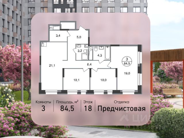 Продается трехкомнатная квартира с отделкой в 7 фазе города-парка "Первый Московский". Общая площадь квартиры - 84,5 кв. м, этаж 18 из 20. Срок сдачи - 1 квартал 2027 года. Тип дома - монолитный. ТОЛЬКО ДО 31 МАРТА выгодные условия на приобретение квартиры в ипотеку или рассрочку. Звоните - и мы подберем оптимальное предложение под ваш запрос! Корпус состоит из 3 секций. Город-парк "Первый Московский" расположен всего в 7 км по Киевскому шоссе от МКАД на территории Новой Москвы. Из города-парка прямой выезд на Киевское шоссе и трассу Солнцево-Бутово-Варшавское шоссе. ТРАНСПОРТНАЯ ДОСТУПНОСТЬ: - 5 мин. на личном автомобиле или 10 мин. на автобусе 189 и 147 до станции метро "Филатов Луг" - 25 мин. пешком до станции метро "Филатов Луг" ИНФРАСТРУКТУРА: Около 7 фазы запланировано строительство детского сада, школы, 2 многоуровневых паркингов. Также на территории проекта есть все необходимые объекты действующей социальной и бытовой инфраструктуры: 8 детских садов, 5 школ, ТЦ, магазины, паркинги, аптеки и др. БЛАГОУСТРОЙСТВО: - Дворы без машин - Игровые зоны для детей, зоны для занятия спортом, зоны для отдыха с навесами/качелями - Детские площадки разделены по возрастным группам - Пешеходный и веломаршрут с двухполосной велодорожкой 2,5 м в ширину - Озеленение с растениями всесезонного цветения ОСОБЕННОСТИ АРХИТЕКТУРЫ: В каждой секции 3 корпуса предусмотрены: - колясочные во входных группах - кладовые помещения с -1 по 20 этажи - коммерческие помещения на 1 этажах - по 4 лифта: 2 пассажирских, 2 грузовых - видеонаблюдение, установленное в холлах первых этажей, у подъездов и на прилегающей территории АВТОРСКИЙ ДИЗАЙН: Входные группы выполнены по авторскому дизайну, оснащены системой "тёплый пол". В каждой входной группе будет располагаться комфортабельная зона ожидания с мягким диваном, акцентными пуфами и столиком.