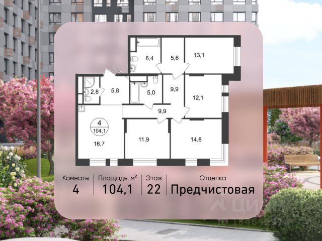 Продается четырехкомнатная квартира с отделкой в 11 фазе города-парка "Первый Московский". Общая площадь квартиры - 104,1 кв. м, этаж - 22 из 22. Срок сдачи - 1 квартал 2026 года. Тип дома - монолитный. Город-парк "Первый Московский" расположен всего в 7 км по Киевскому шоссе от МКАД на территории Новой Москвы. Из города-парка прямой выезд на Киевское шоссе и трассу Солнцево-Бутово-Варшавское шоссе. ТРАНСПОРТНАЯ ДОСТУПНОСТЬ: - 7 мин. на личном автомобиле или 10 мин. на автобусе до станции метро "Филатов Луг" - 10 мин. на автомобиле или 20 мин. на автобусе до станции метро "Рассказовка" или "Саларьево" ВНУТРЕННЯЯ ИНФРАСТРУКТУРА И БЛАГОУСТРОЙСТВО: Дома 11 фазы граничат с Ульяновским лесопарком. В концепции благоустройства воссоздано ощущение естественного взрослого озеленения. Вся территория 11 фазы разделена на 2 типа: - приватное дворовое пространство с детскими игровыми площадками. Дворы свободны от машин. - прогулочные маршруты с зонами отдыха. Прогулочный маршрут объединяет дома 11 фазы в единое пространство, за счёт оригинальной геопластики создаётся уникальный разноуровневый ландшафтный узор. В каждом из домов предусмотрены кладовые помещения на -1 и жилых этажах, а также коммерческие помещения на 1 этаже. На территории 11 фазы запланировано строительство 2 многоуровневых паркингов. АВТОРСКИЙ ДИЗАЙН: Входные группы выполнены по авторскому дизайну, оснащены системой "тёплый пол". В каждой входной группе будет располагаться комфортабельная зона ожидания с мягким диваном и кашпо с крупными растениями. При входе предусмотрено помещение для хранения колясок, на -1 этаже располагается велопарковка.