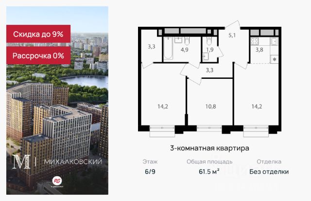 Ипотека для каждого! Полная стоимость кредита от 11,578% до 22,490%. Ставка от 0,11% в АО "Альфа-Банк" фиксируется на 1 год с даты заключения кредитного договора, далее полная стоимость кредита от 25,819% до 28,767% ставка 21,59% до окончания срока кредитования. Первоначальный взнос — от 20% от стоимости квартиры. Срок кредитования — от 3 до 30 лет. Скидка 9% при покупке квартиры! Цена указана с учетом максимального размера скидки. Продаётся 3-к квартира 63,0 кв.м. в ЖК "Михалковский" на 8-м этаже 9 этажного дома. Компания "РГ-Девелопмент" предоставляет скидки на квартиры в жилом комплексе. Акция действительна с 12.09.2024 г. до 30.11.25г. включительно. Чтобы воспользоваться предложением, необходимо подписать договор на приобретение недвижимости до 30.11.25г., включительно. Действует программа "Растет семья - растет и квартира". Прямая продажа от застройщика! Старт продаж новых корпусов. Квартиры без отделки. Срок сдачи 1 кв. 2026 г. Особенности проекта: Завораживающие виды Красивое благоустройство Уникальная локация для Москвы (рядом Головинский парк, пруды, усадьба Михалково) Рядом с центром В проекте присутствует: архитектура голландского бюро MLA+, зеленые зоны, транспортная доступность, благоустроенная территория, подземный паркинг, детский сад и выход на Головинский парк с пятью прудами. Название комплекса указывает на одну из его черт - соседство с имением Михалково. Позвольте себе жить в месте, где проводили свой досуг династии Дашковых и Паниных. Продам 3-комнатную квартиру с отделкой от застройщика станция Лихоборы (МЦК).